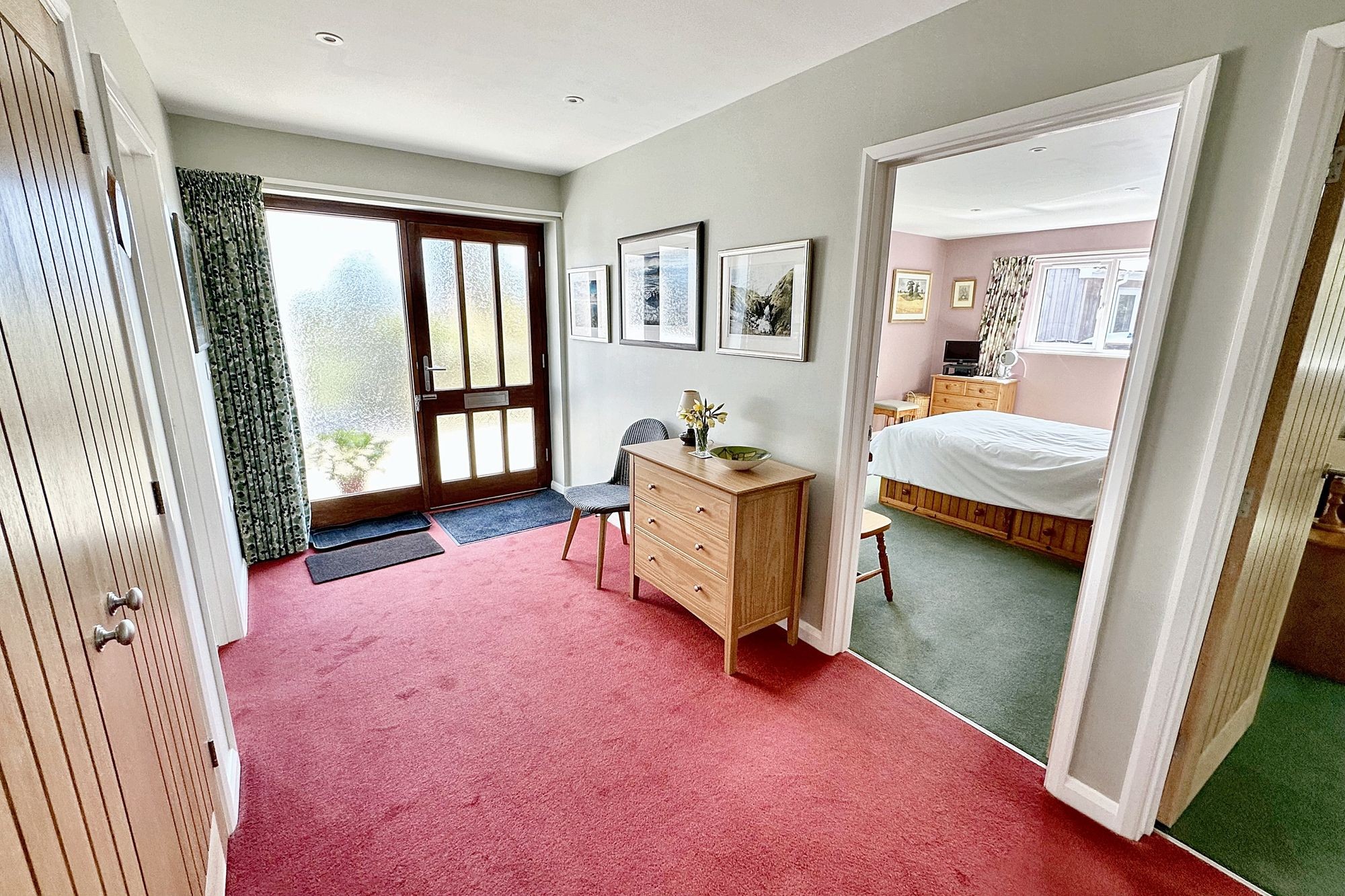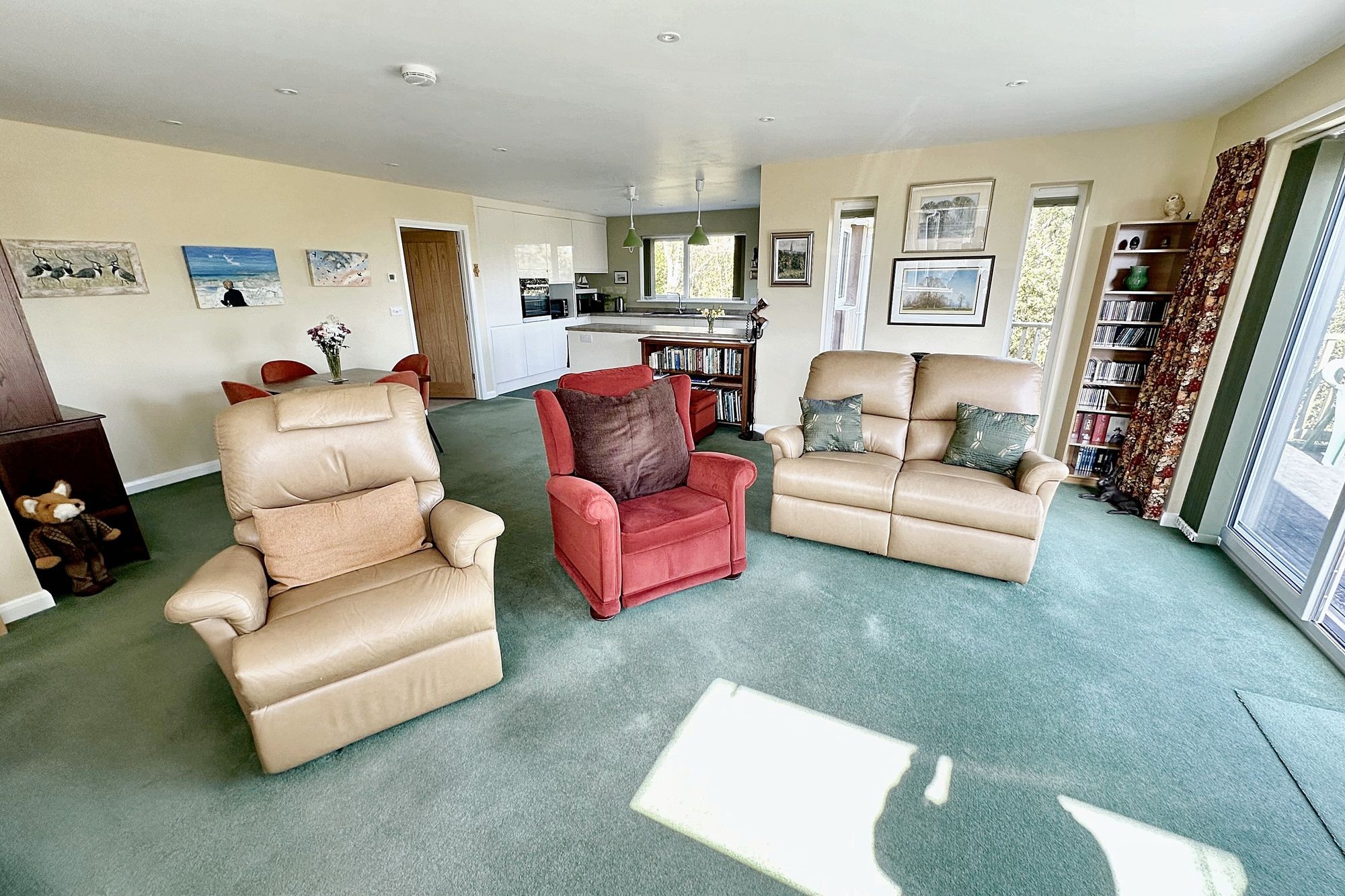 Triple aspect with large UPVC double glazed sliding doors with full height side windows looking out over the garden and giving access to the decked area. UPVC double glazed windows on the other aspects including full height slimline feature windows and doors onto decked area from the kitchen. Modern gloss cream base units with concealed fridge, electric oven, induction hob with extractor over, composite one and a half bowl sink with swan neck mixer tap including a separated filtered water supply. Underfloor heating. Satellite & TV aerial points. Wooden door into…..