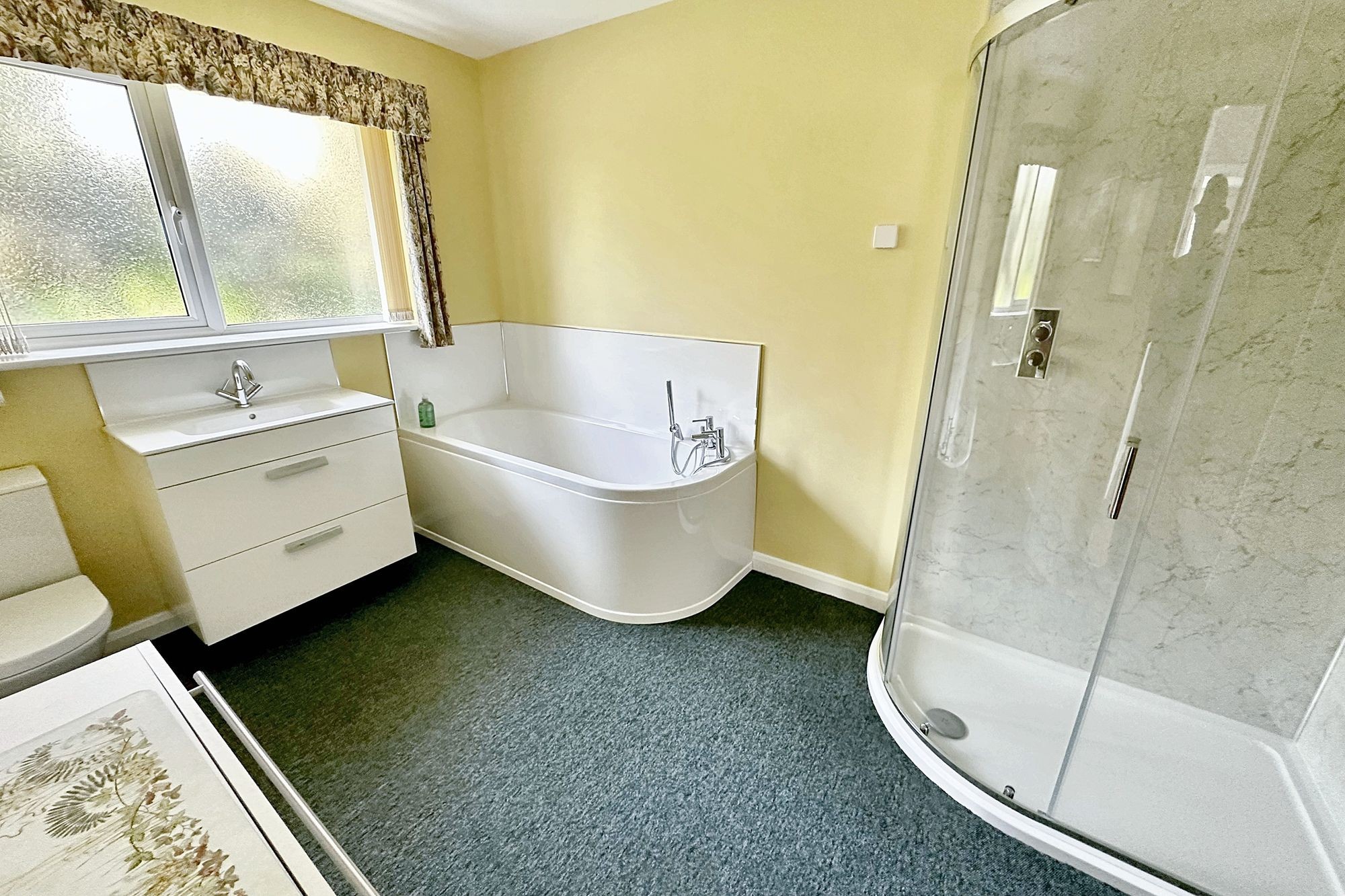 Four piece white suite comprising WC, hand wash basin with swan neck tap and cupboard beneath, bath with hand held flexible spray and corner shower cubicle with plumbed shower over. Tiled wet areas. Heated towel radiator. Underfloor heating.