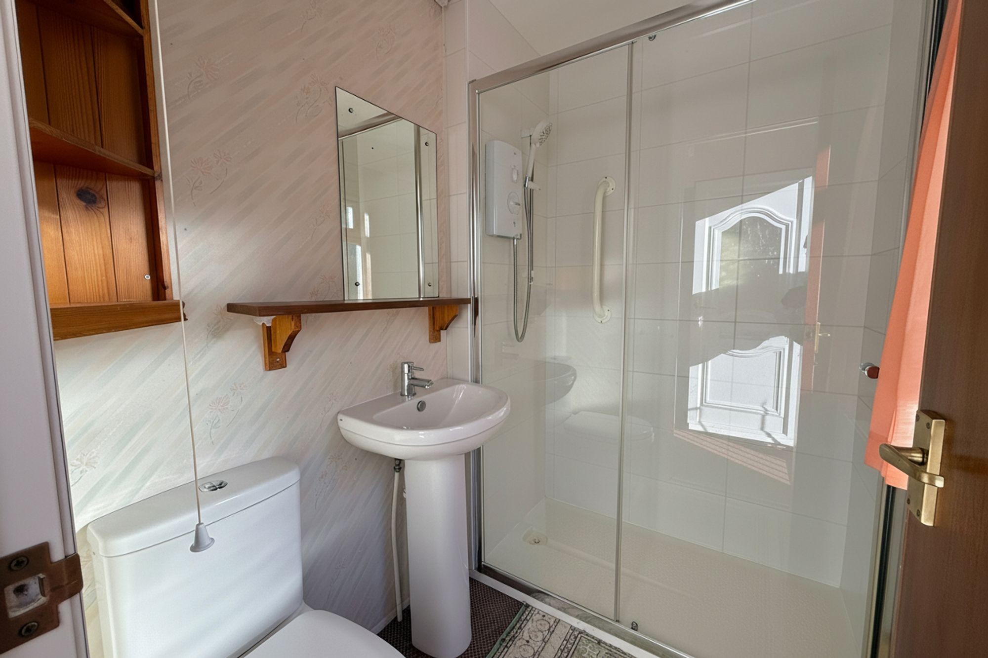 Modern white suite comprising a shower cubicle with glass sliding door, handrail attached to side, electric shower attachment and tiling surround. Wash basin with mixer tap and WC. Obscure double glazed window to the front aspect.