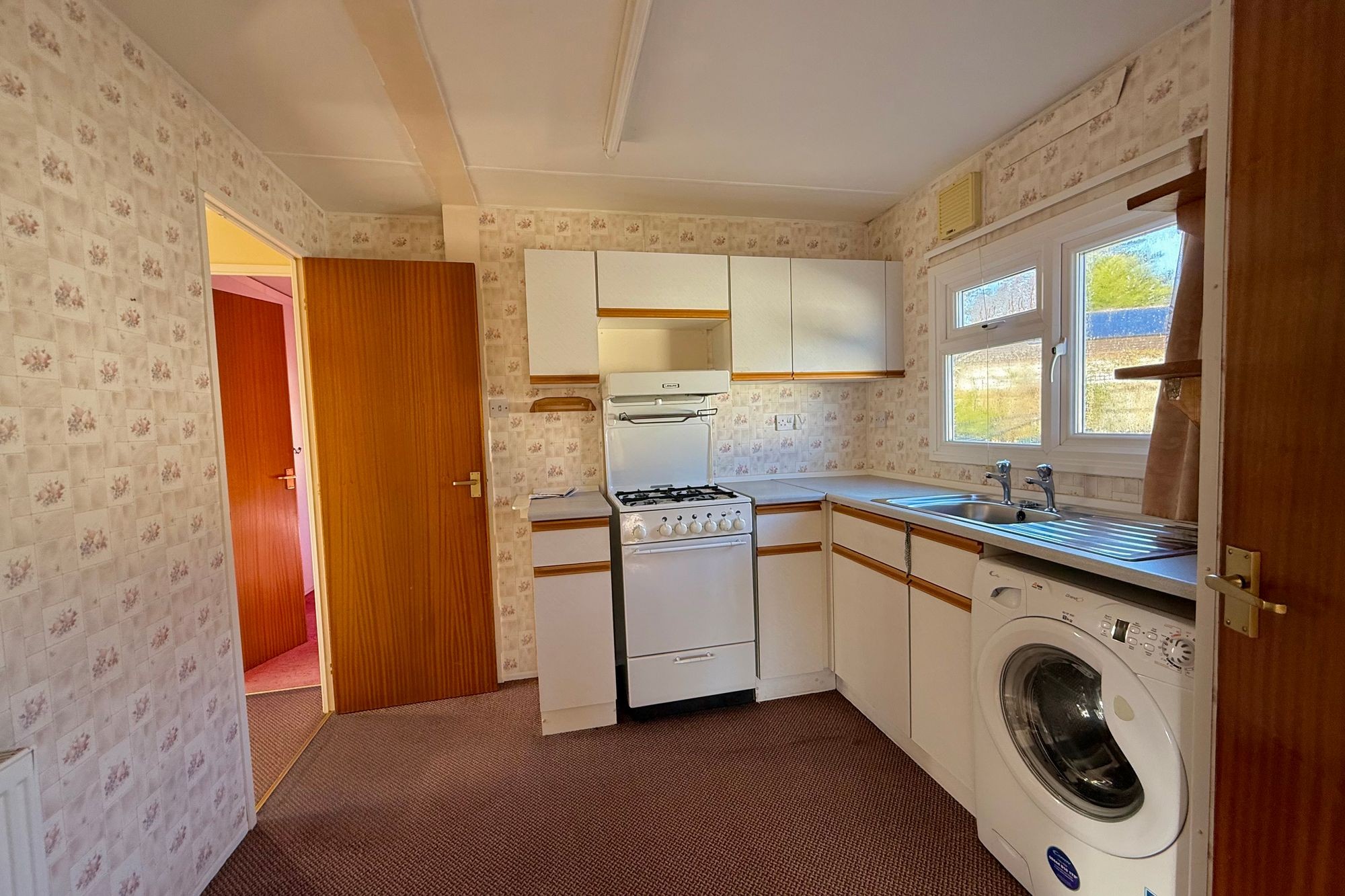 Wood effect range of base and eye level cupboards and drawers, worktop surfaces with inset stainless steel sink and drainer. Space and plumbing for white goods and a gas cooker with extraction hood. Double glazed patio door leads out to the rear garden. Door to cupboard with space and plumbing for a washing machine with shelving and storage.