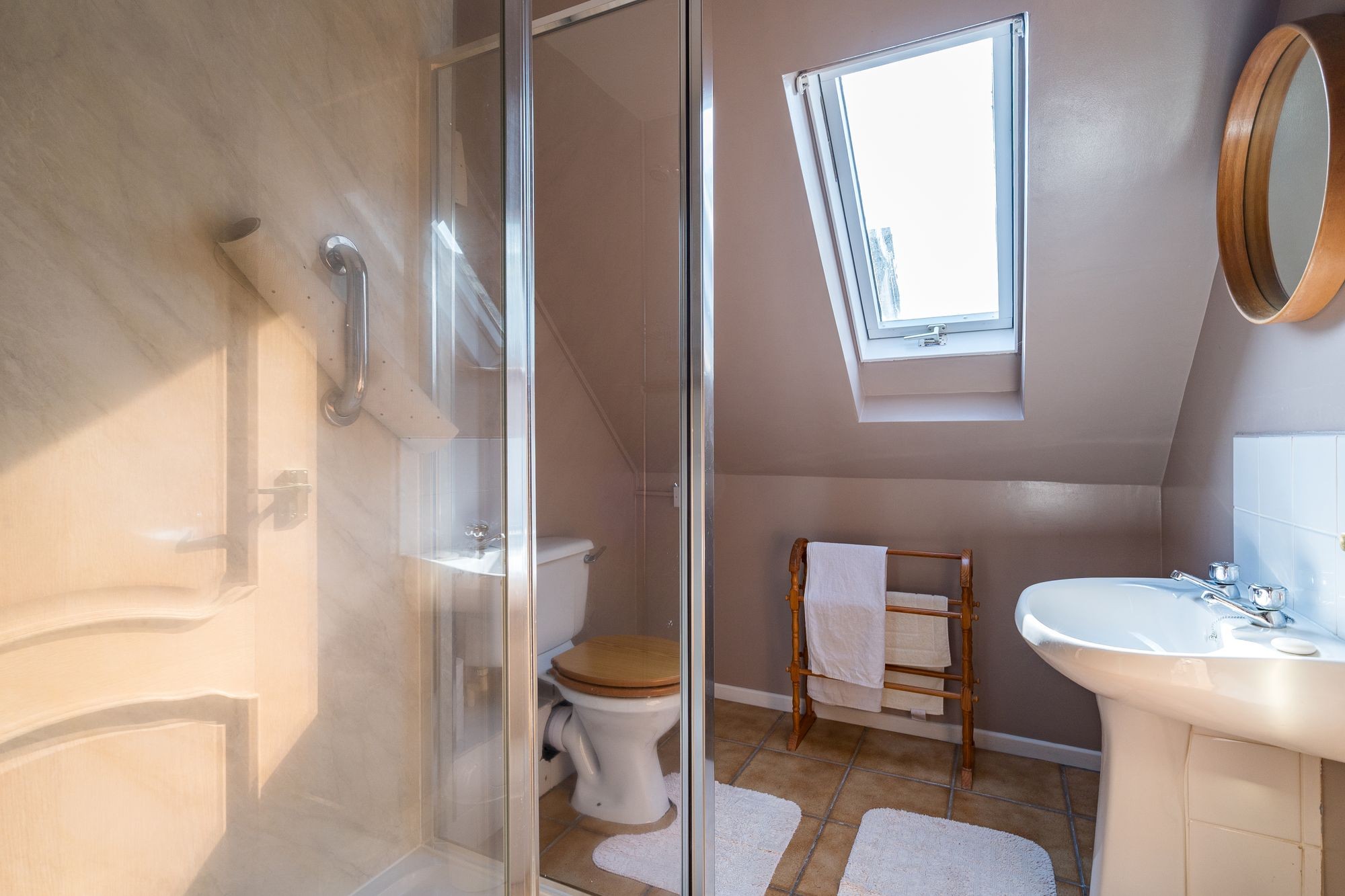 Velux double glazed window to rear. White three piece suite comprising corner shower cubicle, button flush WC, hand basin. Extraction fan.