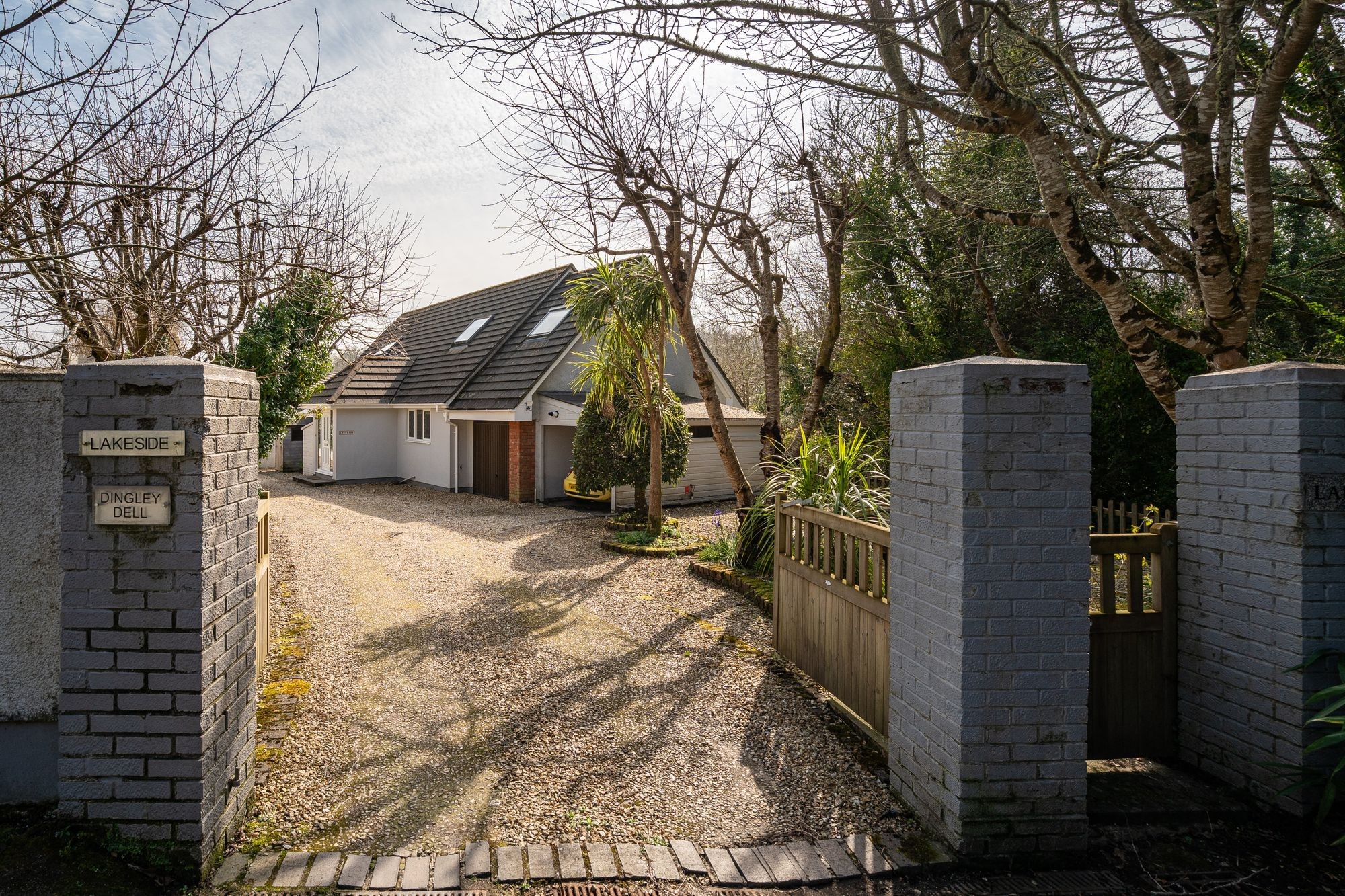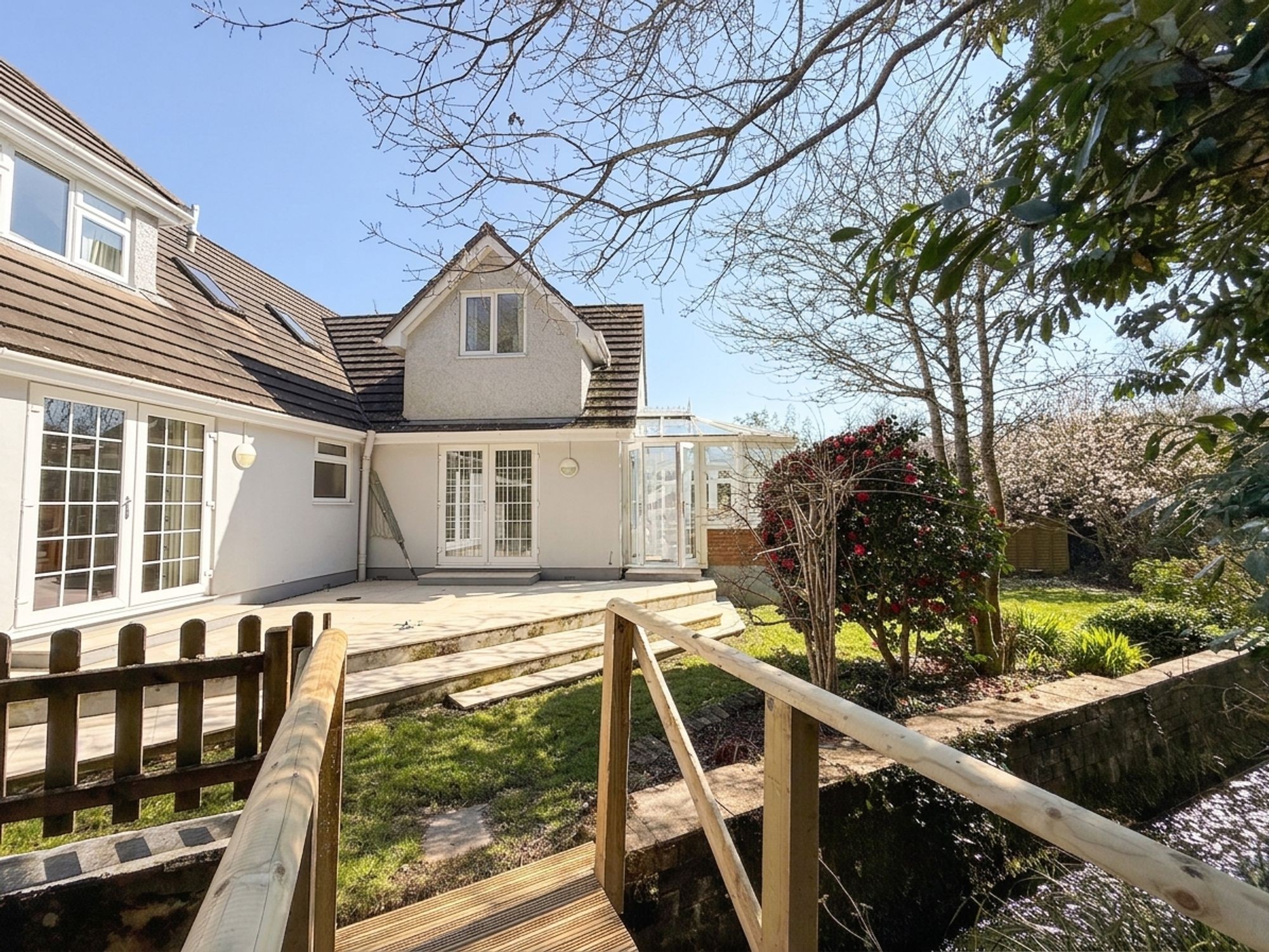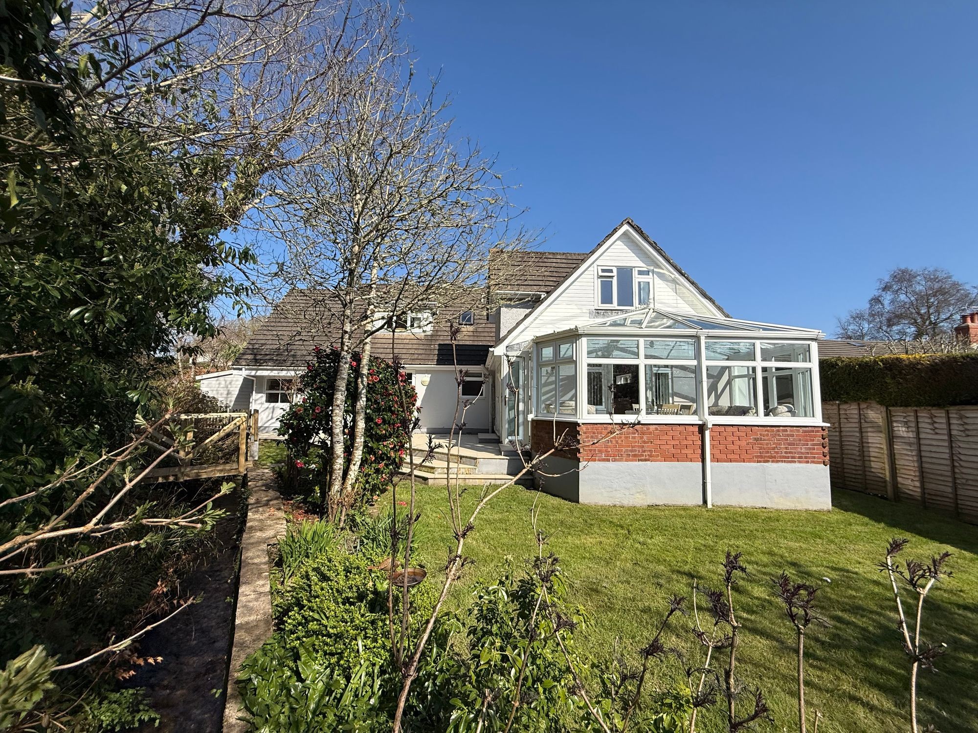 The current owner of Lakeside has loved living here, having first secured the delightfully positioned building plot 30 years ago and with her civil engineer husband, set about creating something special for their retirement. Advancing years have prompted plans to reserve and move to a top notch apartment along Falmouth seafront. This inspired property presents almost 2300²ft of flexible accommodation with some truly ‘stand out’ features. ‘Living space’ is generous with a superb 29’ long reception room, opening into a quality conservatory/garden room. The kitchen/dining room is 23’ long with all of these areas facing south and flowing effortlessly out to the substantial porcelain terrace and the garden. There are four bedrooms, including one downstairs, equally suited as a study, if preferred. The master bedroom suite is fantastic with an uplifting namesake view of the neighbouring lake with plenty of visiting birds and wildlife. This room is ensuite and has a huge dressing room with extensive built in wardrobe and cupboard space. There are bath/shower rooms up and downstairs and the kitchen/dining room leads internally to the generous single size garage. All is comfortable and well equipped: lovely to have a quality, stylish woodburning stove in the reception room, as well as radiator central heating throughout. It’s practical too, with plenty of storage space throughout. A discreet, splayed entrance off Comfort Road leads onto a driveway owned by Lakeside and serving it and one other home, Dingley Dell, beyond. The rear garden faces south and is private and enclosed, where a stream tumbles beside and is wonderfully audible when relaxing on the expansive porcelain terraces. All in all this is a gem of a property, presenting so many valuable features within this most popular of creekside communities.