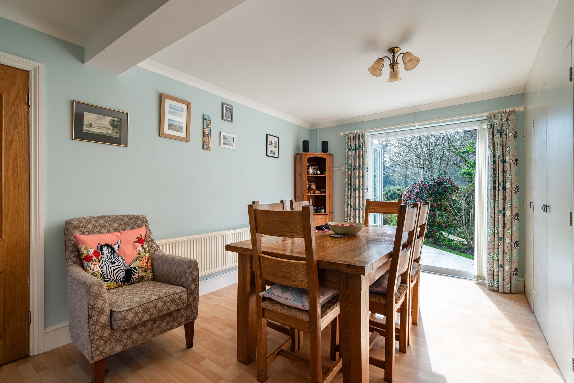 A welcoming and generous space, galleried to the first floor landing. Under stair cupboard. Radiator. Cupboard housing electric meter and tripping switches. Solid oak panelled doors to sitting room, (through to conservatory), to kitchen and dining room, bedroom four/study and bathroom.