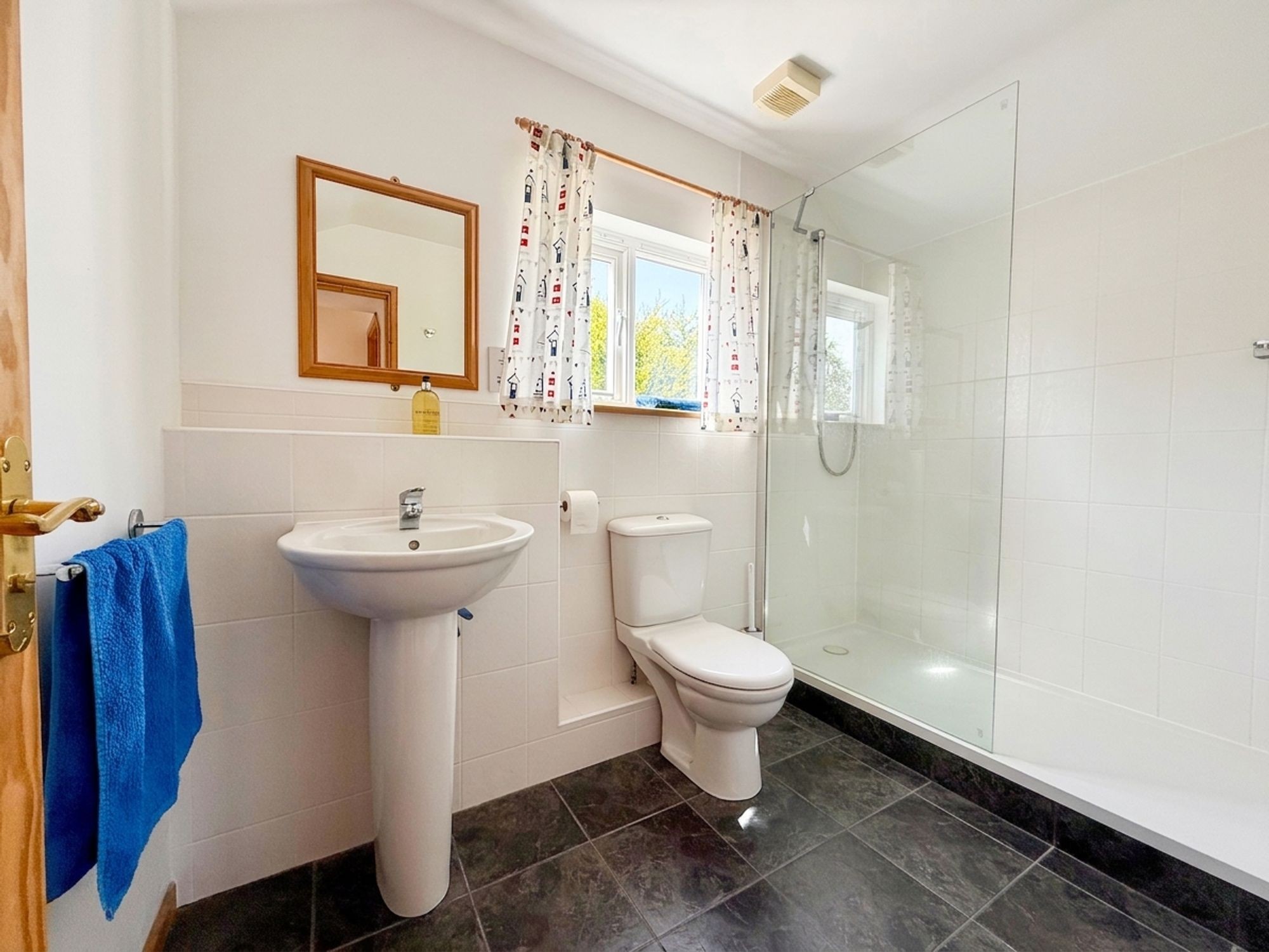 Double glazed window to rear overlooking the garden. White three piece suite comprising dual flush WC, hand basin and over-sized shower cubicle with electric shower. Heated towel radiator. Shaver point. Extractor.