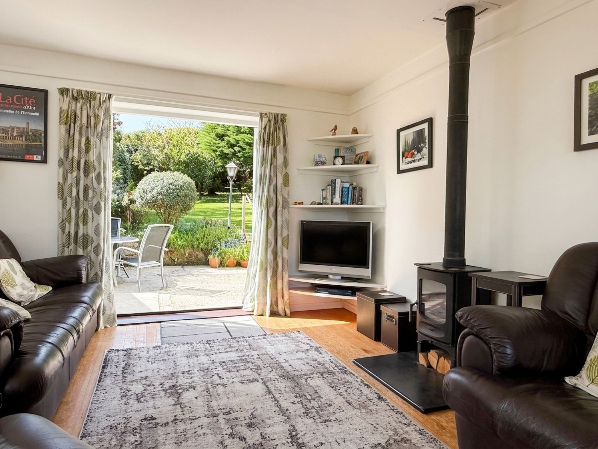 A super triple aspect room with UPVC double glazed bowed window to side. Picture window to front with fine open outlook and wide double glazed French doors facing South out onto the terrace and garden. Scandinavian log burner on a slate hearth. Exposed wooden floorboards. Two radiators. Corner shelving. Picture rail. Pendant and semi-circular wall lights.