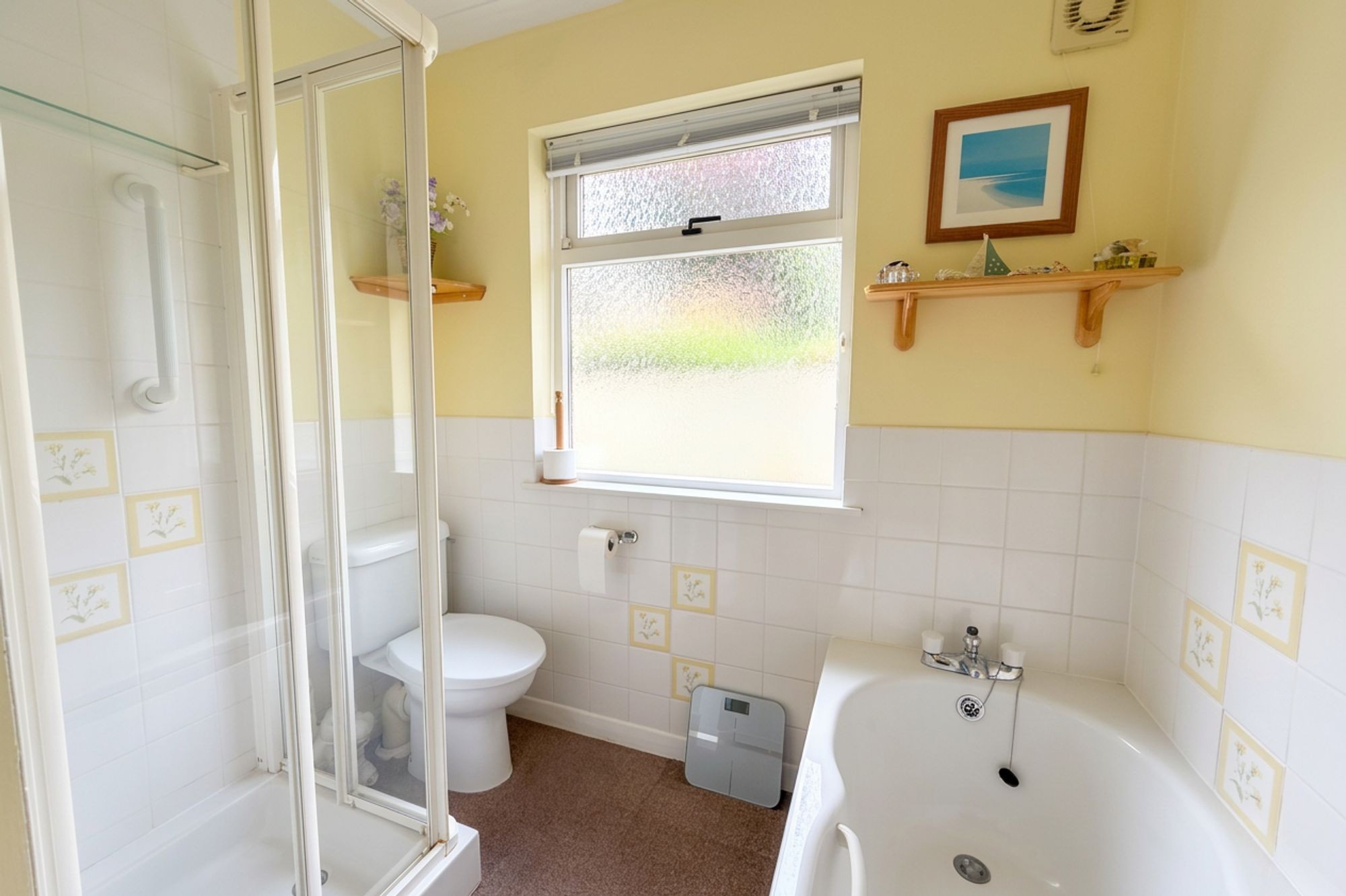 White suite comprising bath, WC, hand wash basin and separate shower cubicle. Obscure window to the rear.