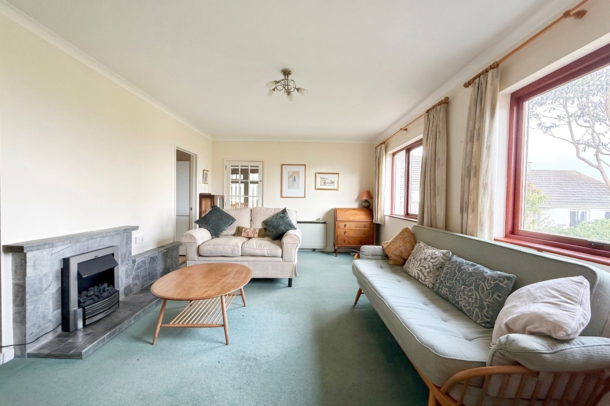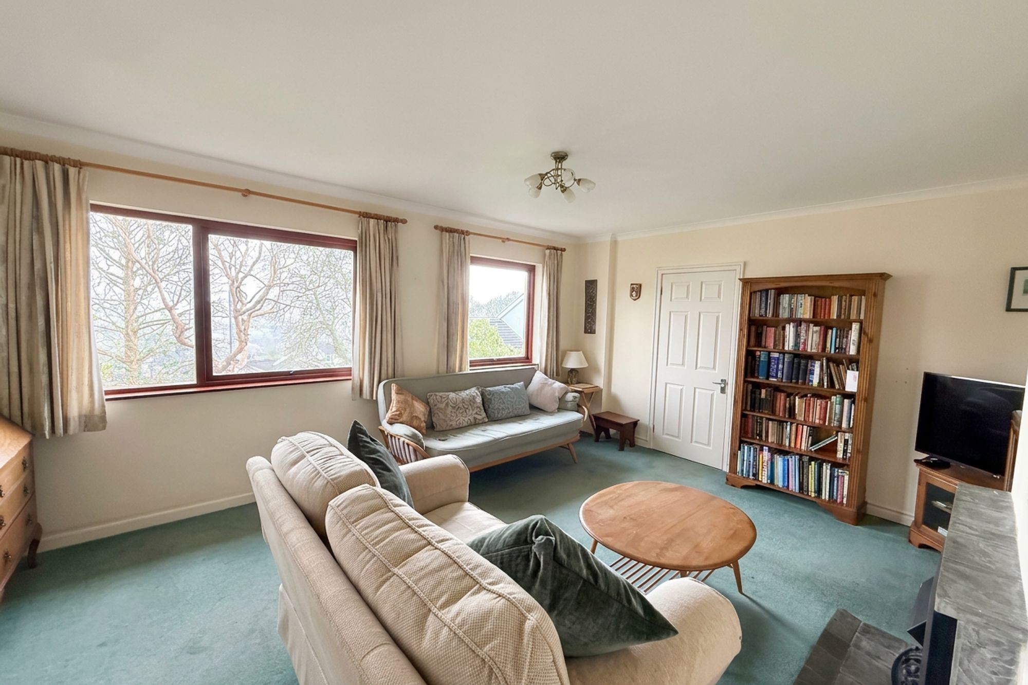 Generously sized room with two large windows to the front with far reaching countryside views reaching to the sea. Door to kitchen and door to…..