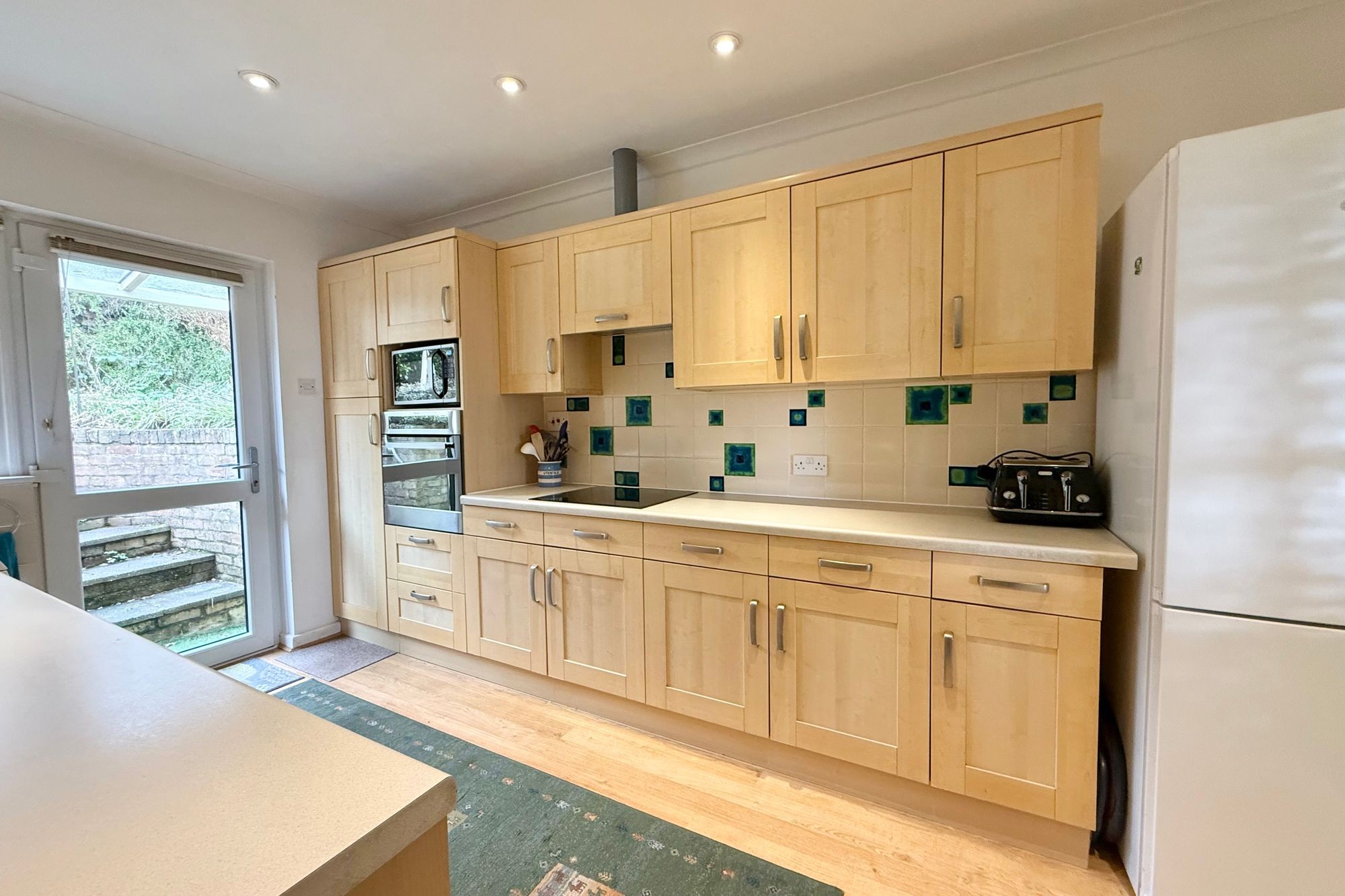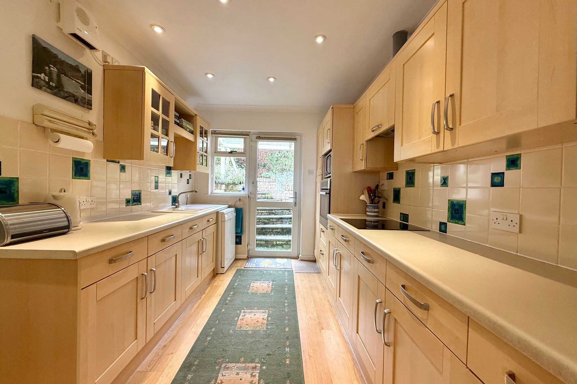 Galley style with eye and base units running along either side. Many metres of useable work surface plus built-in appliances. Door to the rear.