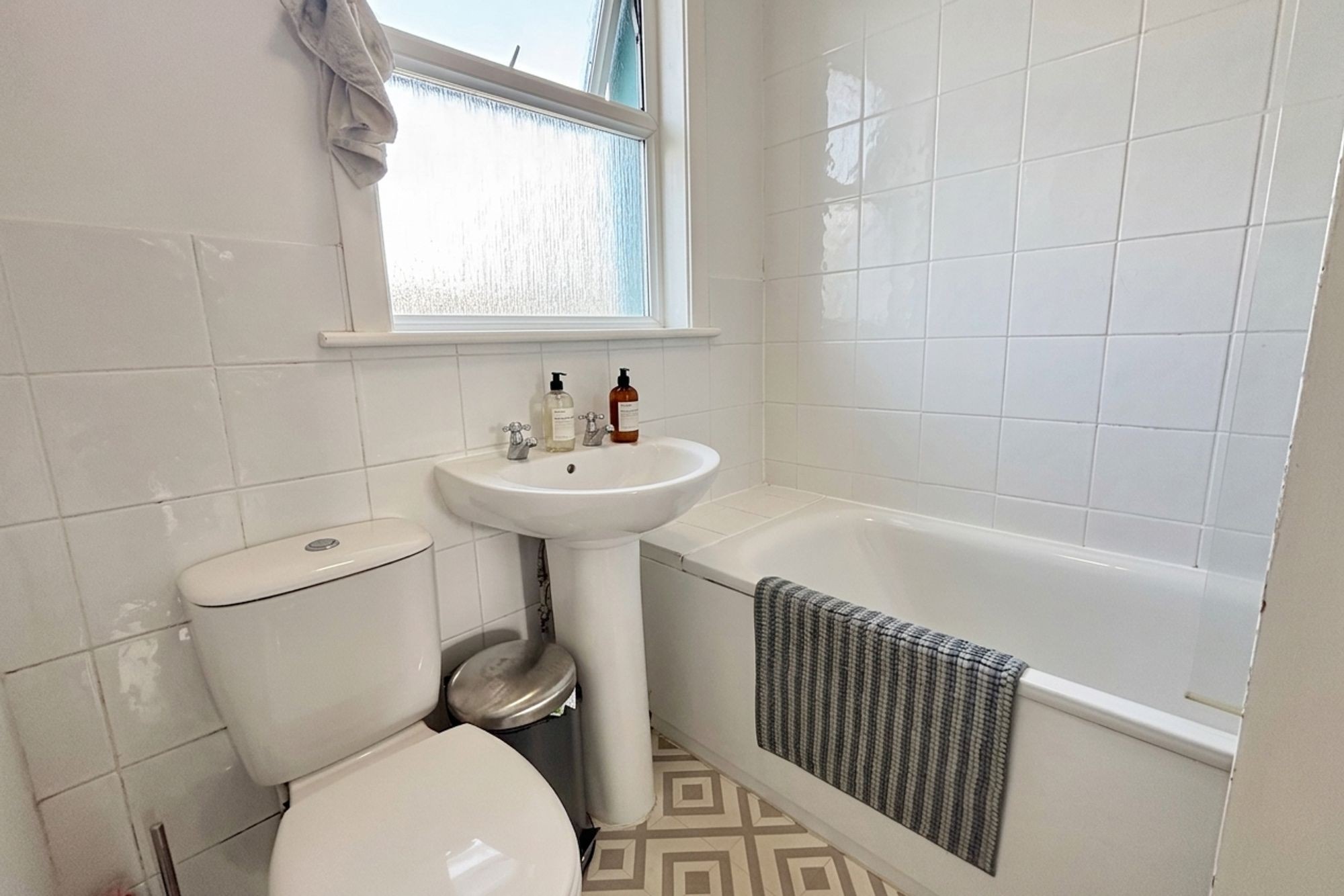 uPVC opaque double glazed window to rear. Three piece white suite comprising WC, hand wash basin with chrome taps and bath with electric shower over. Tiled wet areas. Tile effect laminate flooring. Radiator. Extractor.