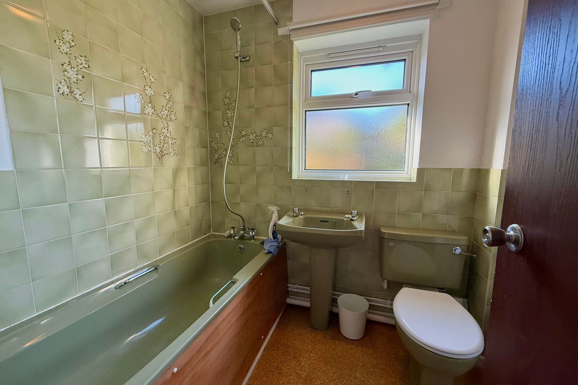 Dated suite and in need of an uplift currently comprising a bath with mains shower over and curtain rail, wash basin and a WC. Obscure double glazed window to the rear aspect. Fully tiled around the bath and half tiled to the remainder of the bathroom. Shaver point and radiator.