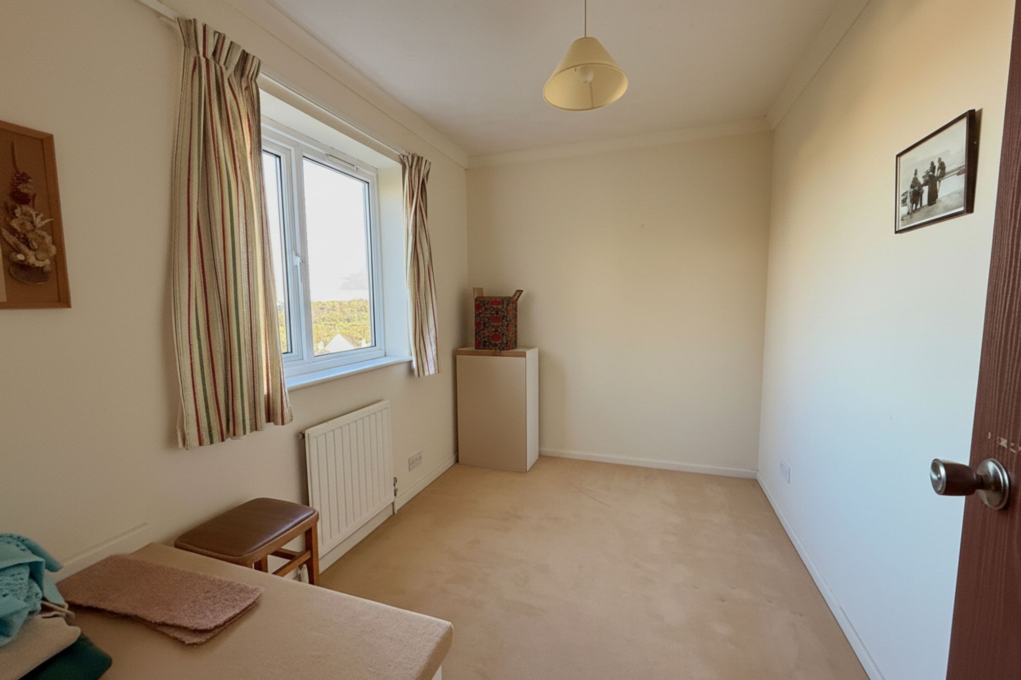 UPVC double glazed window to side with a pleasant wooded outlook towards Falmouth. Stair box above and Radiator.