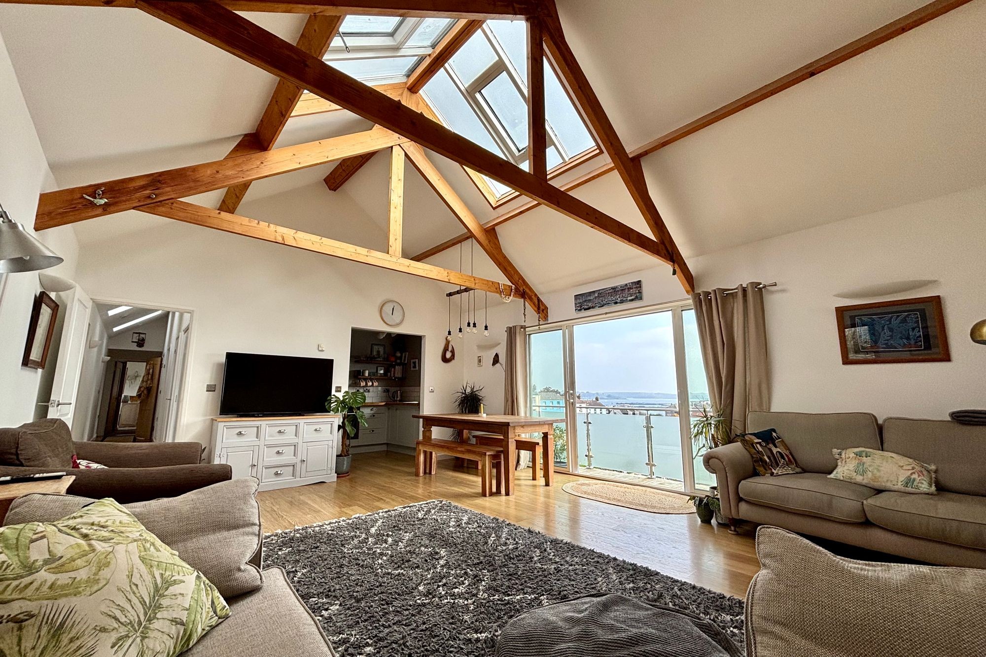 What a lovely room! High vaulted ceiling with exposed wooden trusses and roof light that floods the room with natural light. Large patio doors out to a terrace with great far reaching water and town views. Oak effect flooring with underfloor heating, wood burning stove on a slate hearth, archway through to the: