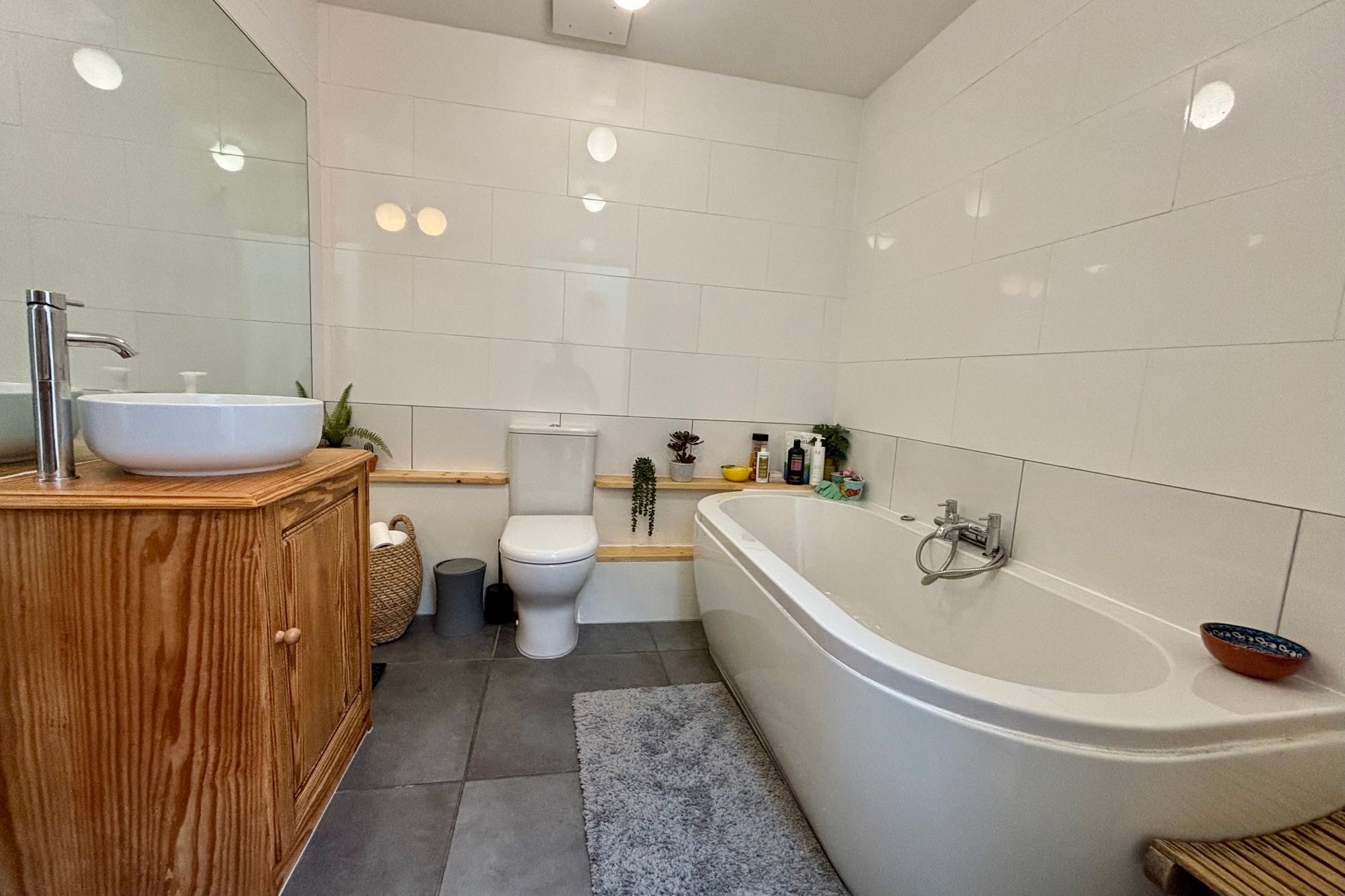 Recently updated by our vendor, comprising a white suite of W/C, bath with central taps and shower attachment, designer hand wash basin on vanity unit with mixer tap, tiled walls and flooring, heated towel rail, under floor heating, extractor fan.