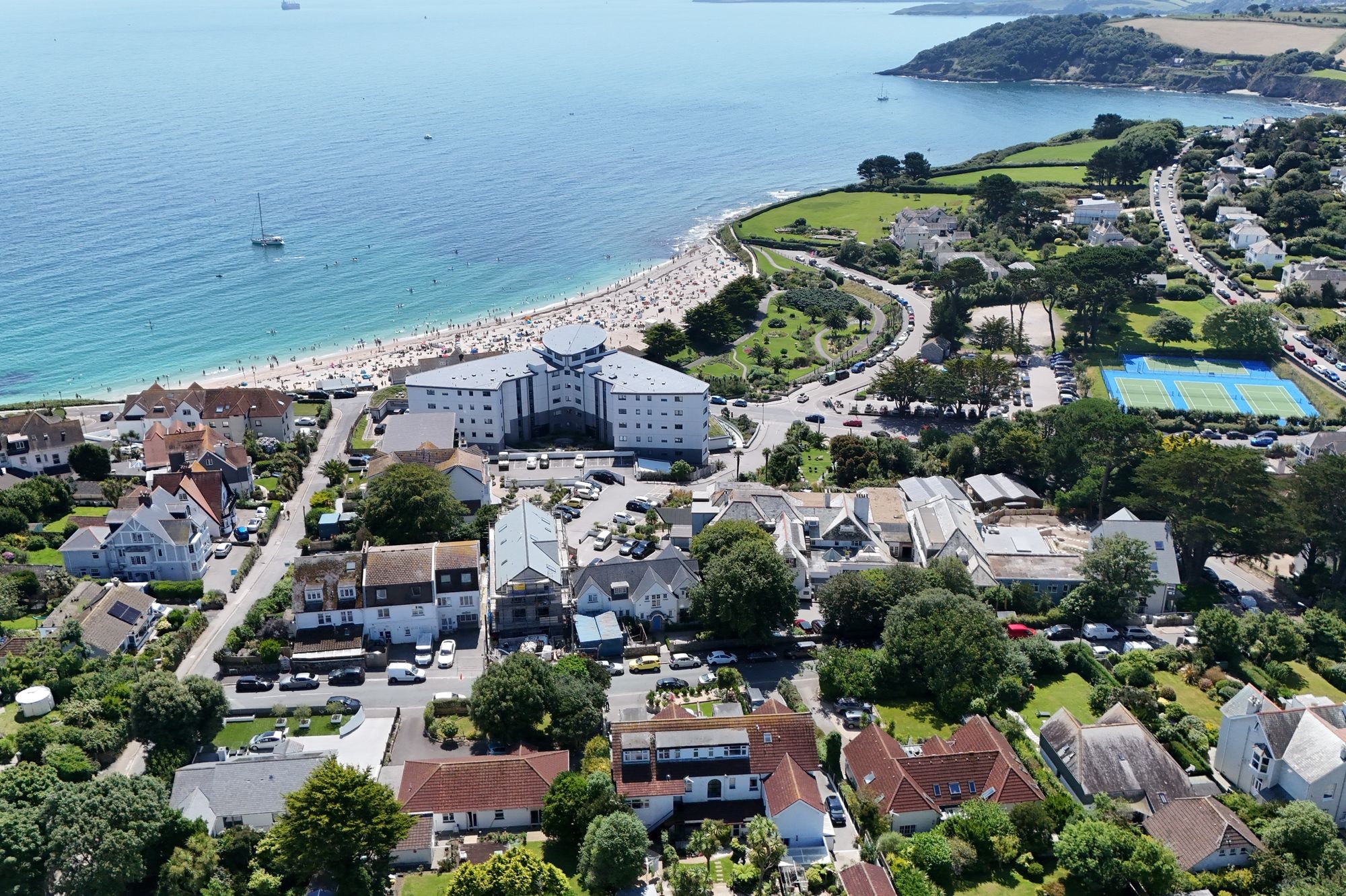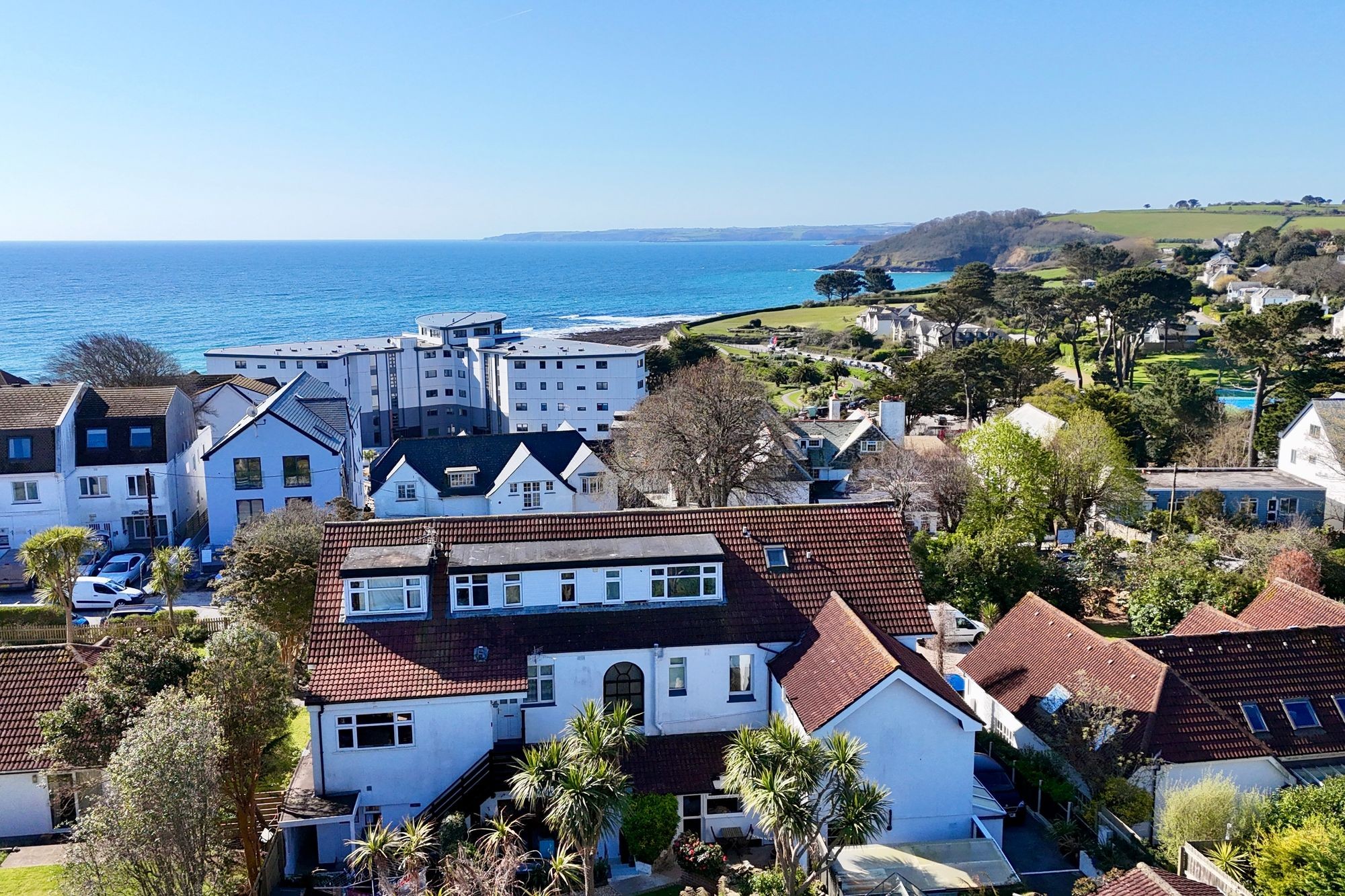 Thought to have been built in the 1920s, Pantiles Hotel was a favourite destination for holidaymakers for decades before the Pearce family converted it into 9 apartments in the late 1980s, creating a stylish and contemporary apartment. The apartments are no longer allowed to be commercially holiday let but one could have Number 7 as their own residential full time home or personal holiday home. Long letting is allowed and each owner has a share of the freehold and of course a say in what happens with the building. Apartment 7 is situated on the second floor and can be accessed via a communal front door with a wide turning staircase leading up to the first floor and a further staircase accessing the apartment. The accommodation is lovely and bright, with a southerly aspect that gives you views towards Falmouth Bay. At the back, you can enjoy views of the beautifully maintained communal gardens. The apartment comprises a living area with fitted seating bays, space for dining and a Velux window facing Southerly, offering views towards Falmouth Bay and the surrounding area. A well-appointed modern fitted kitchen and a modern shower room. The main double bedroom faces to the rear and the second bedroom to the front aspect with access out to the Southerly facing balcony to sit outside and enjoying panoramic 180 degree views. A good level of storage with both bedrooms benefitting from large, fitted wardrobes and an outside allocated outbuilding specifically for the apartment. An allocated off-road parking space situated to the front of the building. The apartments enjoy communal gardens with outside seating and dining spaces to enjoy in the sunshine and surrounded by beautiful plants, shrubs and trees. There is a 999-year lease in place since 2008. NO ONWARD CHAIN.