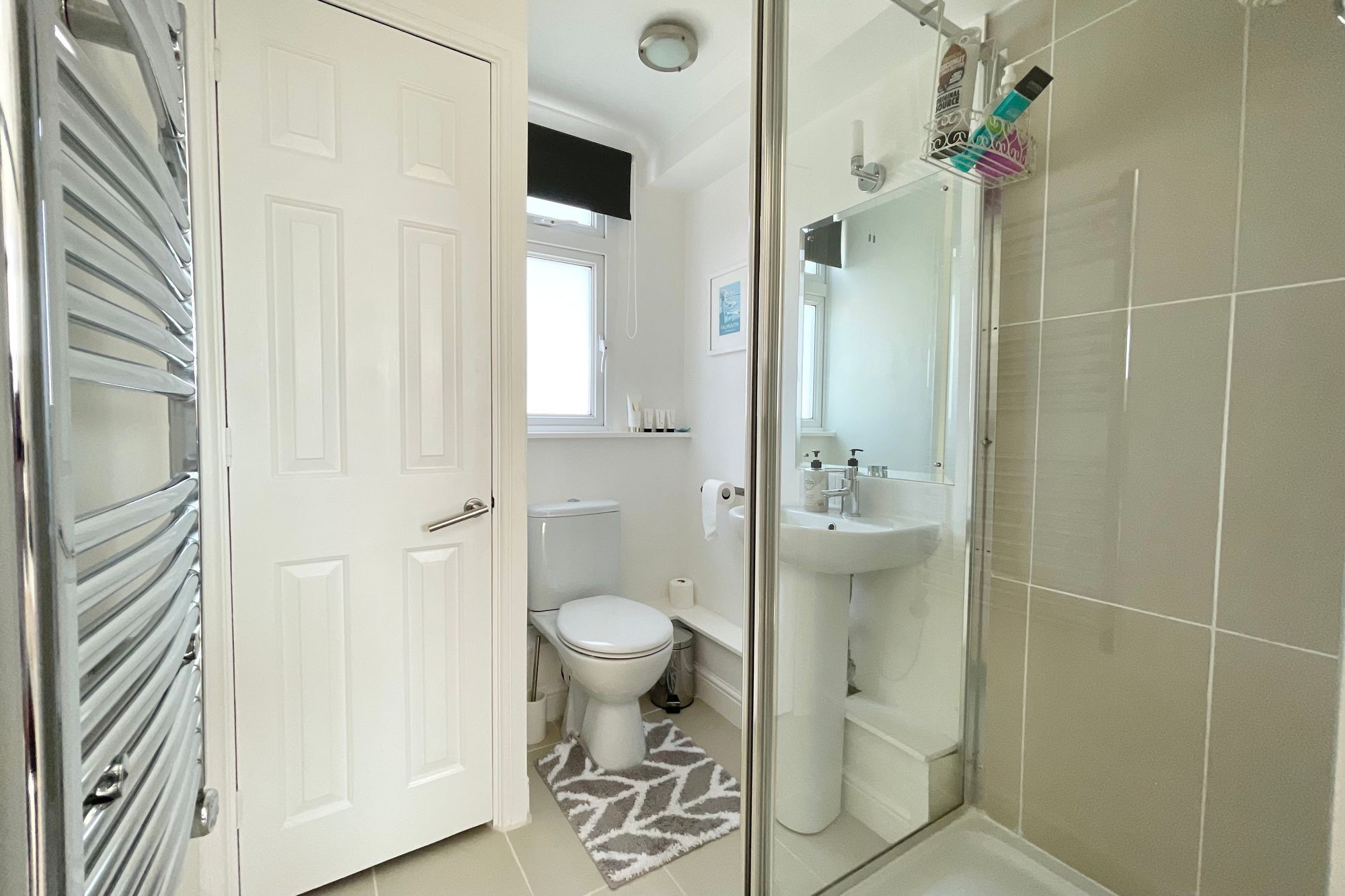 A bright and modern shower room, comprising an enclosed shower cubicle with 'Mira Sport' electric shower unit with tiled walls surrounding, pedestal wash basin with chrome mixer tap, low flush WC. Obscure UPVC double glazed window to the rear of the property. Built-in airing cupboard housing the hot water cylinder and shelving below. Tiled flooring and ceiling spotlights. Heated towel radiator and extractor fan.