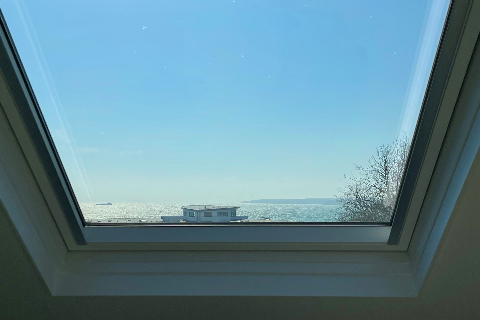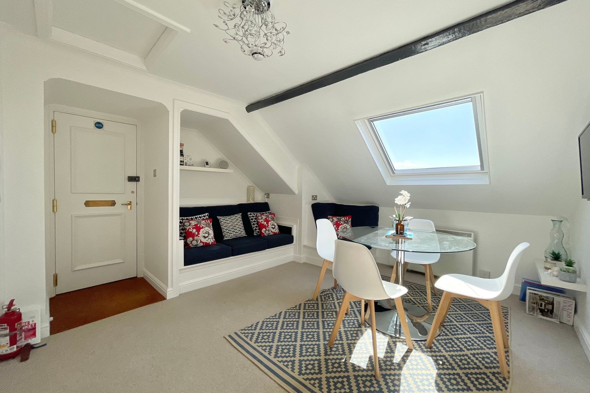 15' 3" x 13' 3" (4.67m x 4.06m) (sloped ceiling). A particularly light, open-plan living space, featuring built-in recessed alcove seating adjacent to a large Velux double glazed window enjoying magnificent views over Falmouth Bay, towards the mouth of the Helford River and The Manacles beyond. Matching gloss-painted panelled doors to the kitchen, both bedrooms and the shower room. Creda night storage heater. TV, satellite and telephone points. Adjustable ceiling spotlights and loft hatch above.
