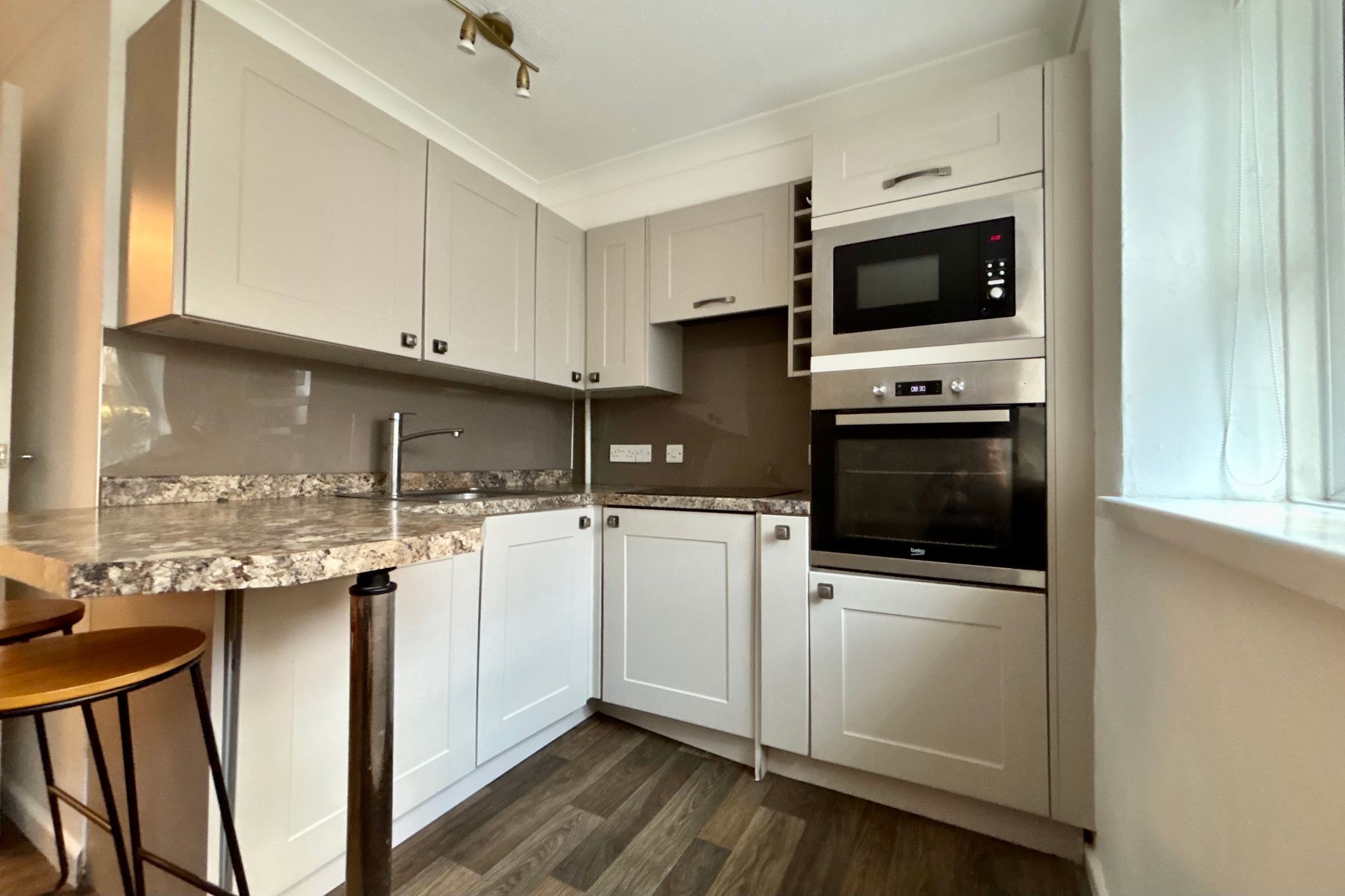 UPVC double glazed window. Modern kitchen comprising grey base and eye level units with stone effect laminate worktop with inset Stainless steel sink with chrome mixer tap. Tiled splashback. Breakfast bar. Built-in fridge with freezer compartment, microwave, electric oven and hob with extractor over. Space and plumbing for washing machine machine/tumble dryer. Wood effect laminate flooring. Electric radiator. Dimmable lights. TV point.