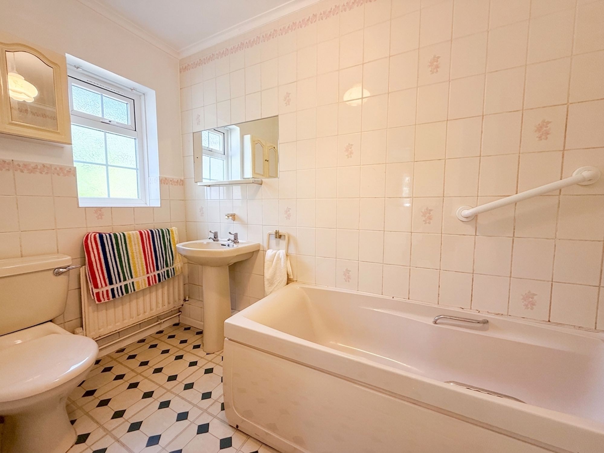 Three piece suit comprising WC, hand basin and panel bath with boiler fed shower over. Obscure UPVC double glazed window to rear. Radiator.
