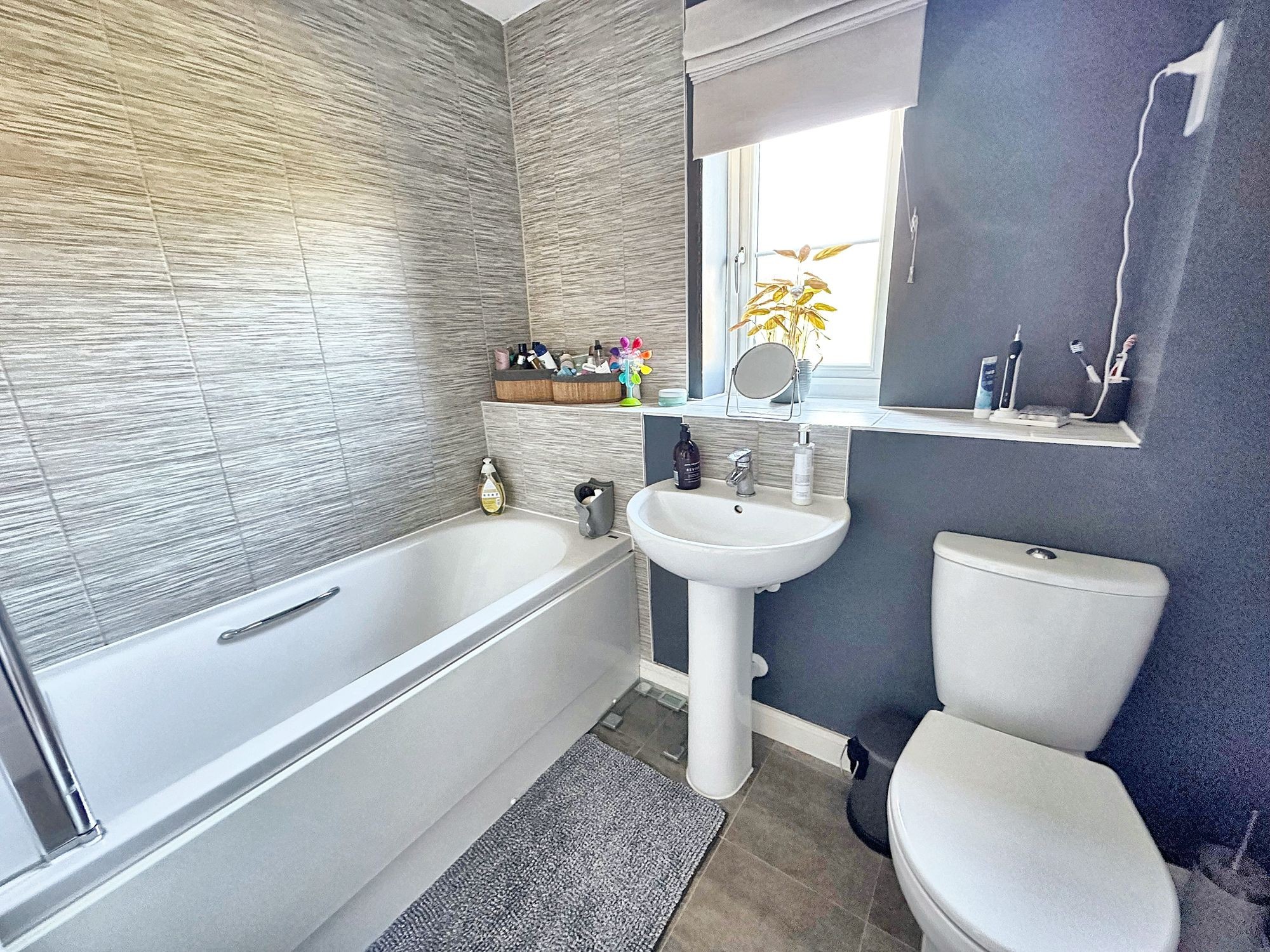 White three piece suite comprising WC, pedestal hand wash basin and bath with mixer tap and shower over, glass screen to side. Shaver point. Obscure window to front. Radiator. Extractor.