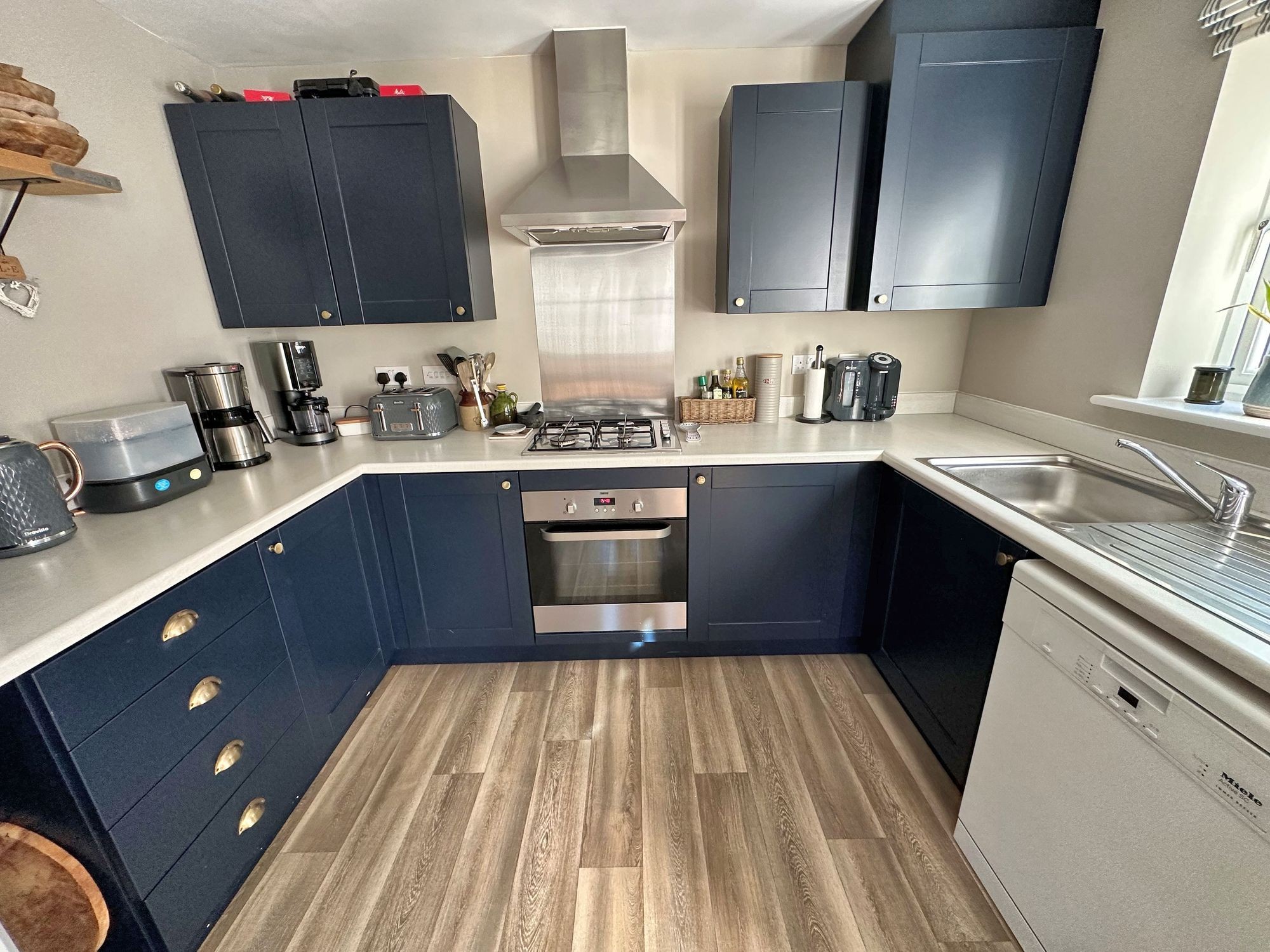 Again full of natural light with three windows on two sides, plus door to the rear garden. A range of dark blue fronted eye and base cupboards and drawers complimented by white worktops with inset stainless steel sink and drainer with mixer tap. Built-in electric oven with gas hob and stainless steel extraction hood over and stainless steel splashback. Space for white goods. Cupboard housing the gas combination boiler fuelling radiator central heating and hot water supply. The dining area is generously proportioned with space for a table and six chairs. Further white fronted storage cupboards. Wood effect laminate flooring. Radiator.