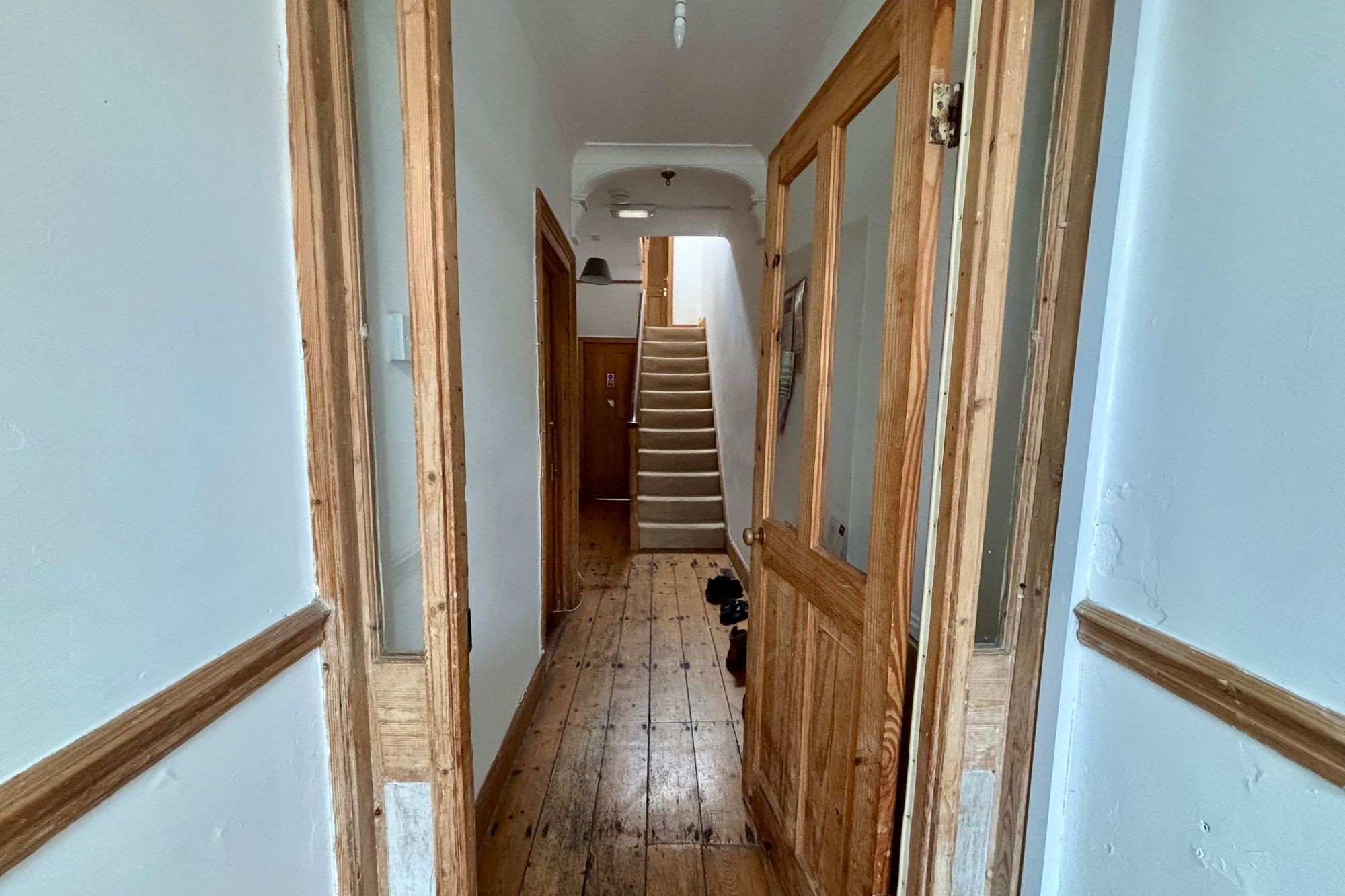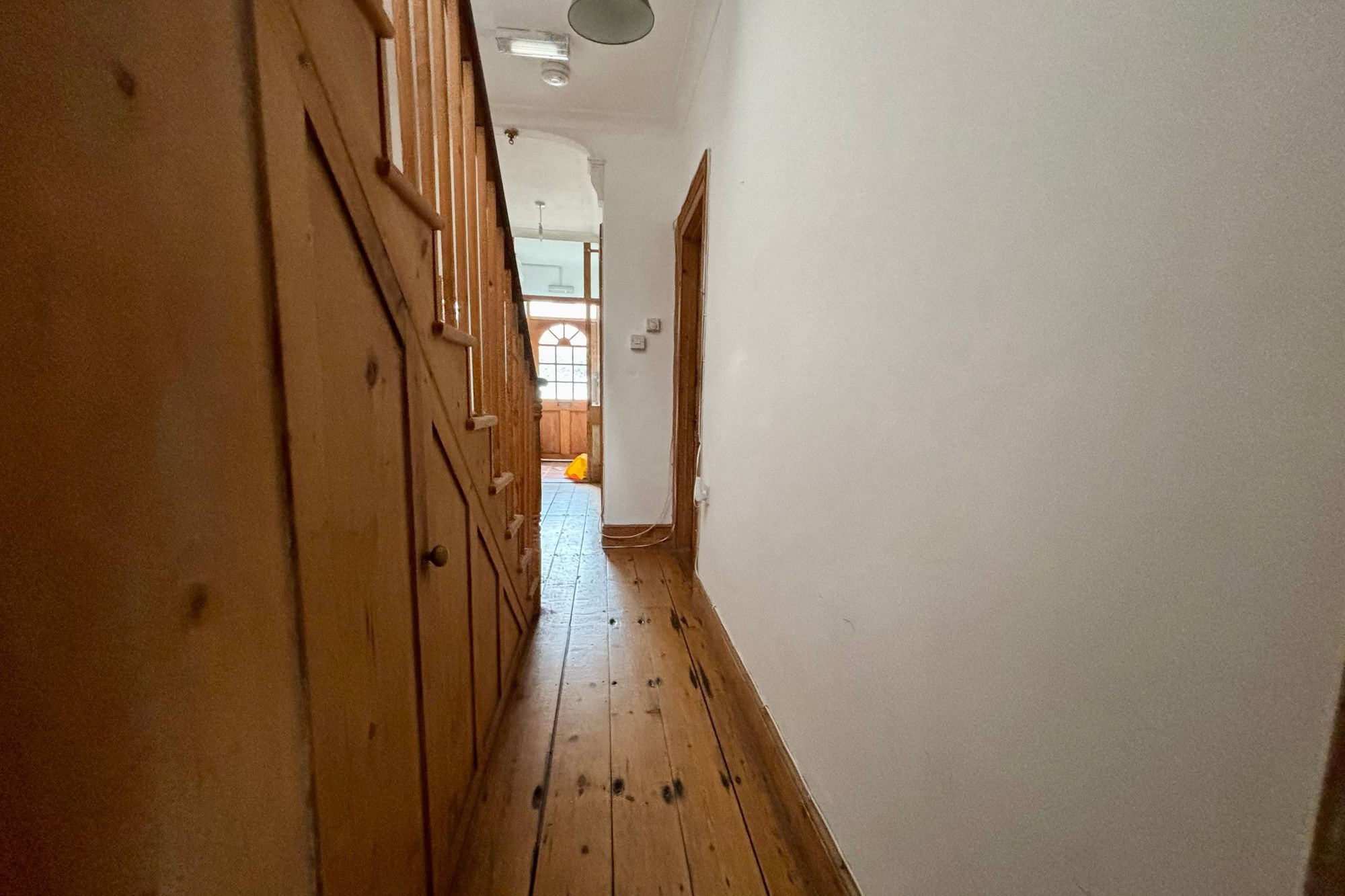 Inner porch with emergency lighting, fusebox and tiled flooring leading to a second half glazed wooden door with window surround to the main hallway. Stairs rising to the first floor. Emergency lighting with smoke detector. Under stairs cupboard. Thermostat and radiator. Wooden floor boards. Fire doors to bedrooms and to the….