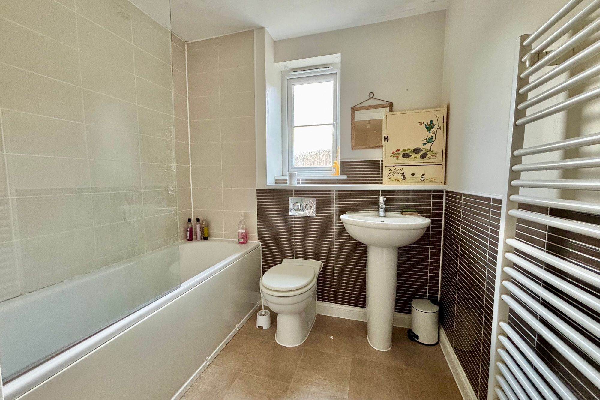 Opaque uPVC double glazed window to side. Three piece white suite comprising WC, Pedestal hand wash basin with chrome mixer tap and bath with plumbed shower over and glass screen. Tiled wet areas. Heated towel radiator. Tile effect laminate flooring. Extractor.