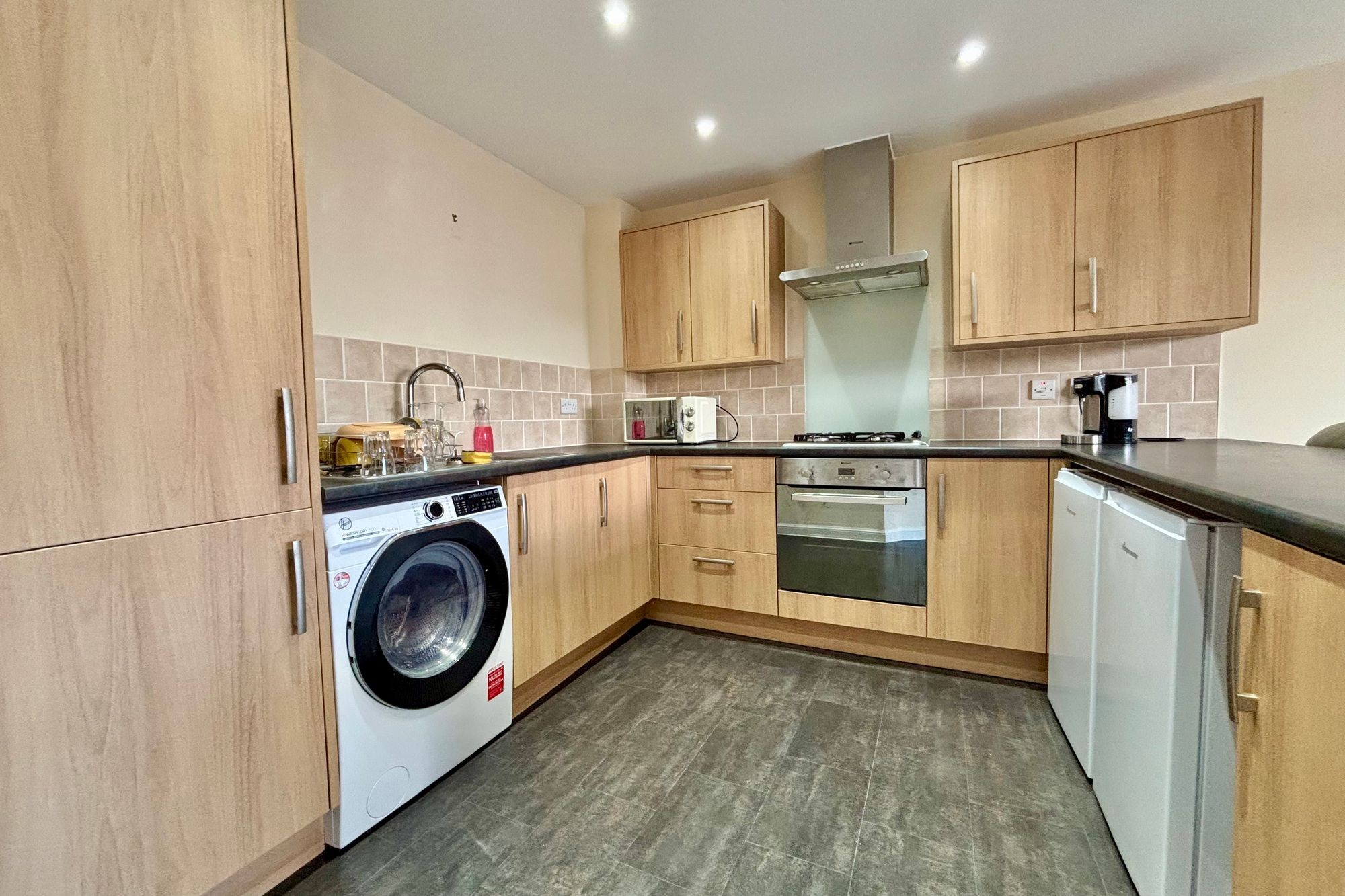 Fitted with a modern range of base and eye level units with laminate worktops and a stainless steel hand wash basin with chrome mixer tap and tiled splashback along with a breakfast bar. Integrated electric oven with gas hob and extractor above. Space for washing machine, fridge and freezer. Laminate flooring.