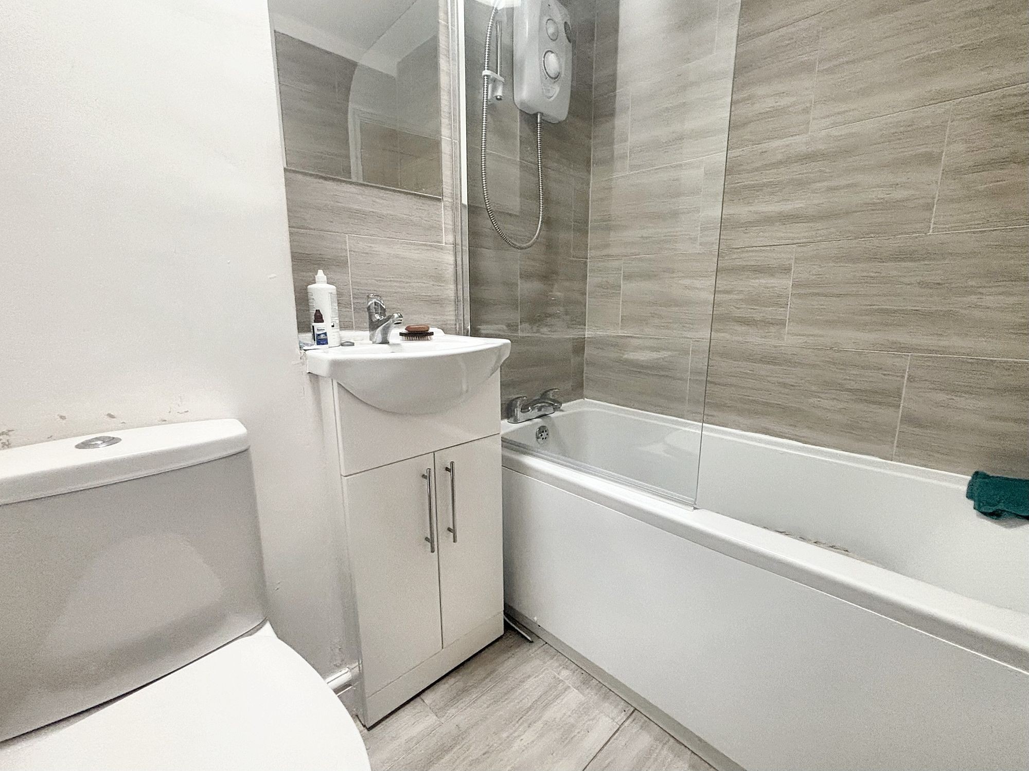 Three piece white suite comprising WC, hand wash basin with cupboard below, chrome mixer tap and electric mirror above. Bath with glass screen and electric shower. Heated towel radiator. Tiled wet areas and flooring. Light tunnel providing natural light to the bathroom.