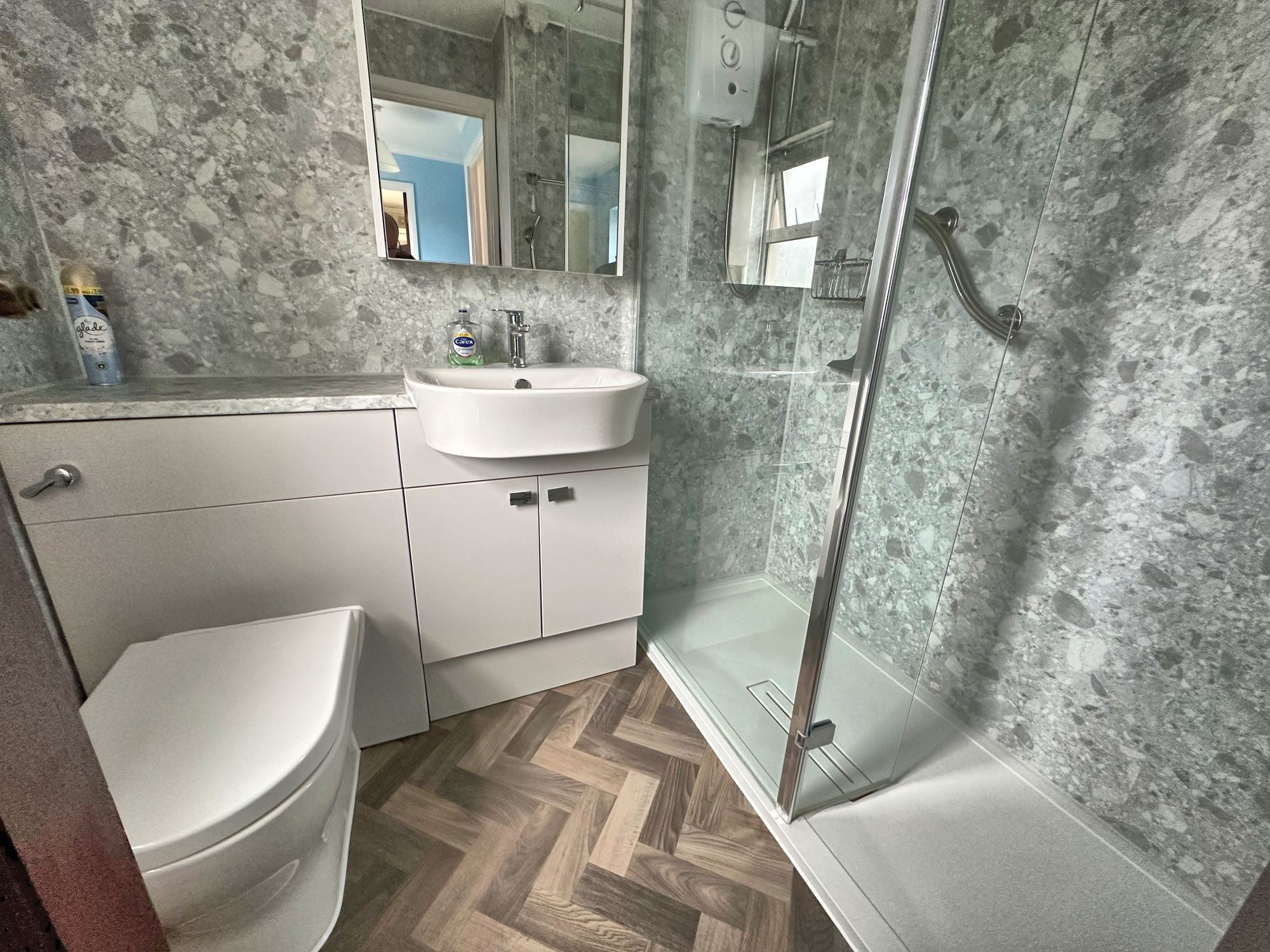 Modern suite in white, W/C, hand basin in vanity unit and large walk-in shower cubicle with electric shower over and wipe-down wall panels. Chrome radiator. Obscure window to the rear.