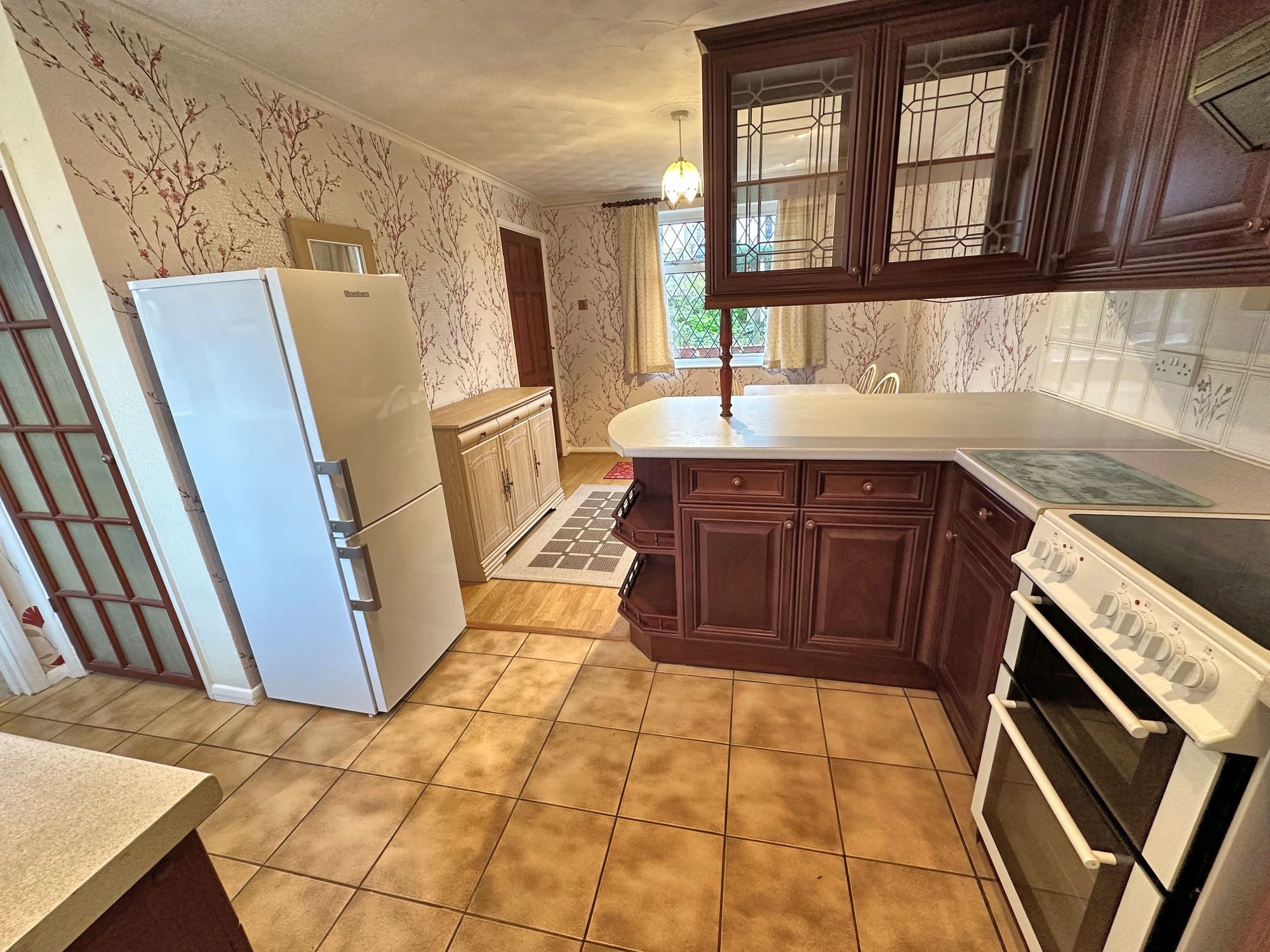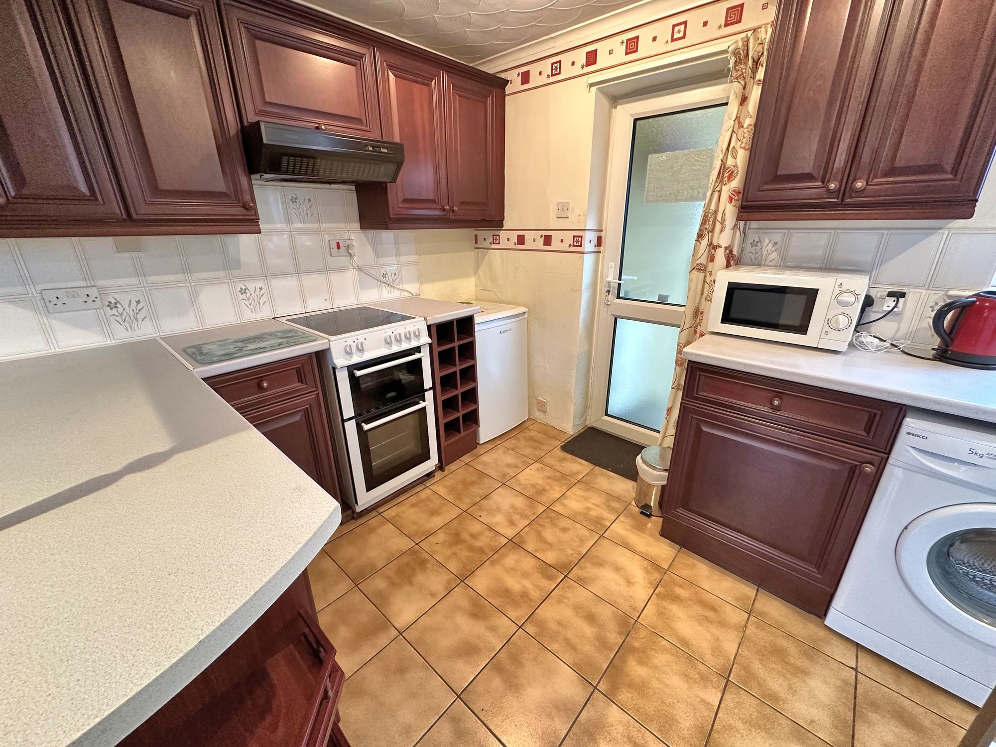 The kitchen is well-appointed but in dark wood, which isn’t in Vogue at the moment, but a lick of paint to duck-egg blue or cream would transform it. A window to both the front and rear brings in natural light, and a door to the rear gives access to the storeroom.