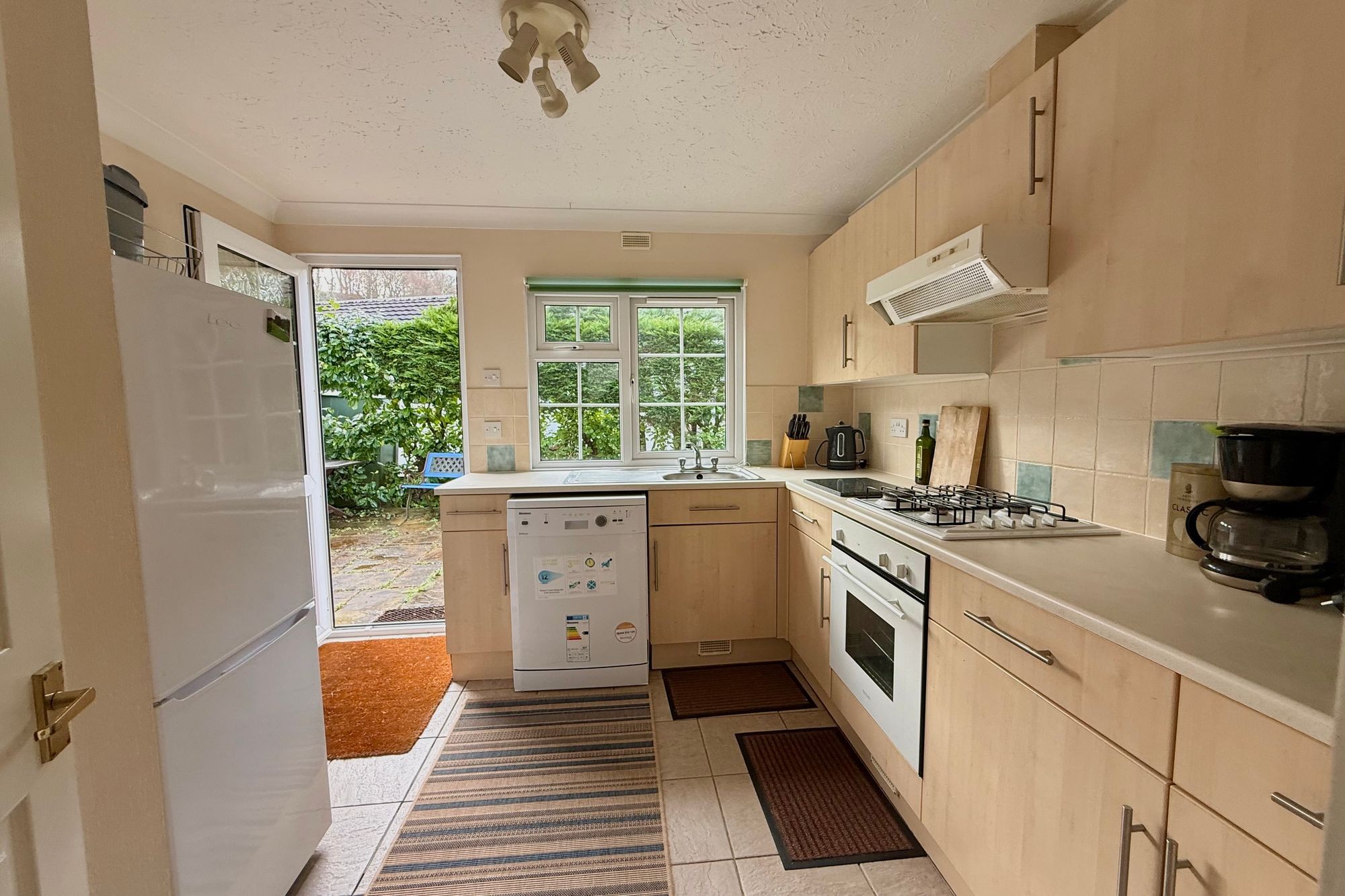 Good-sized, nicely fitted room with UPVC double glazed window to rear garden and wooded view. Wood effect range of base and eye level cupboards and drawers, tiled splashback with plenty of worktop surfaces and inset stainless steel sink and drainer. Space and plumbing for white goods and a gas cooker with extraction hood. Double glazed patio door leads out to the rear garden. Door to cupboard with space and plumbing for a washing machine with shelving and storage.