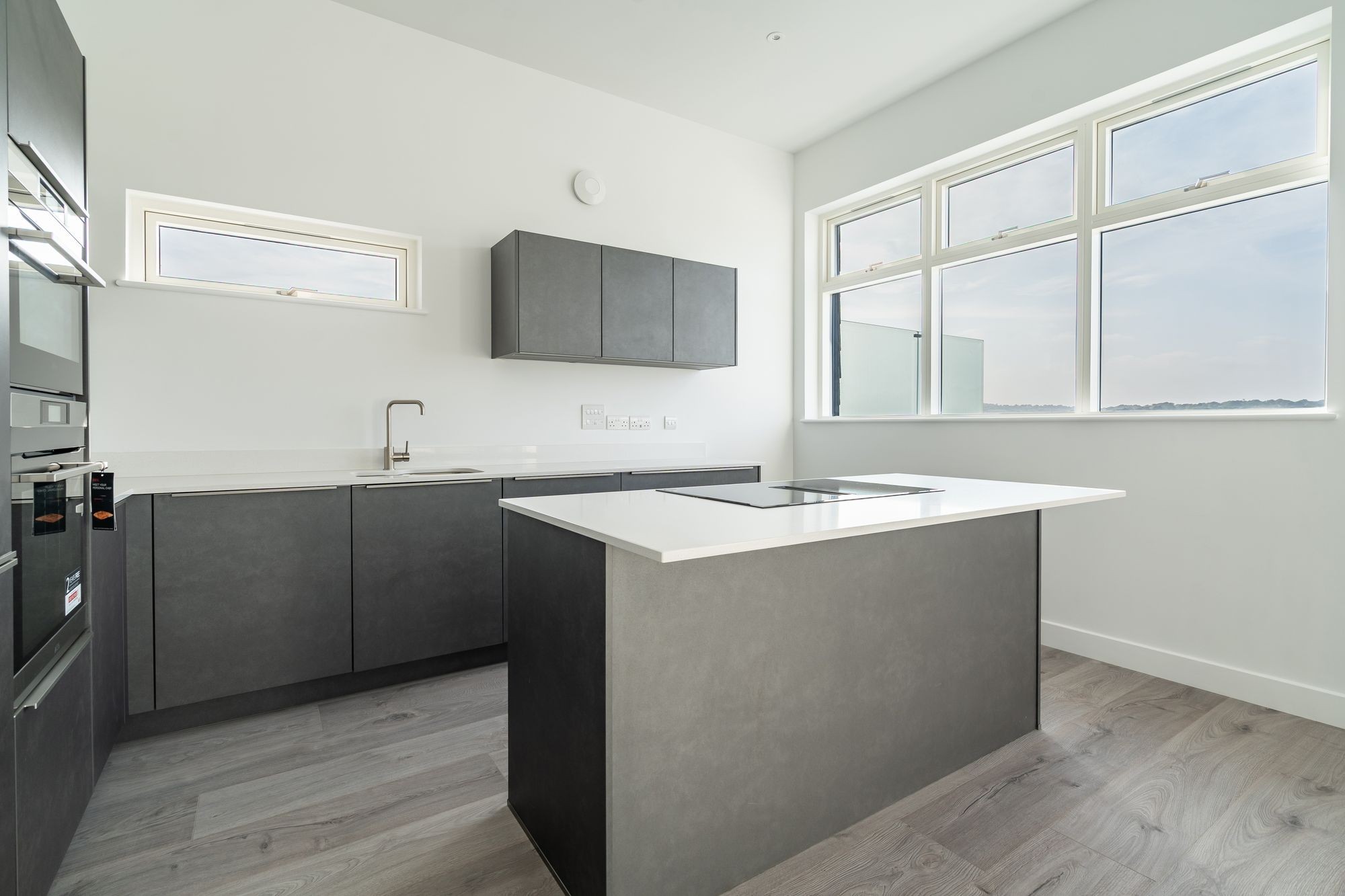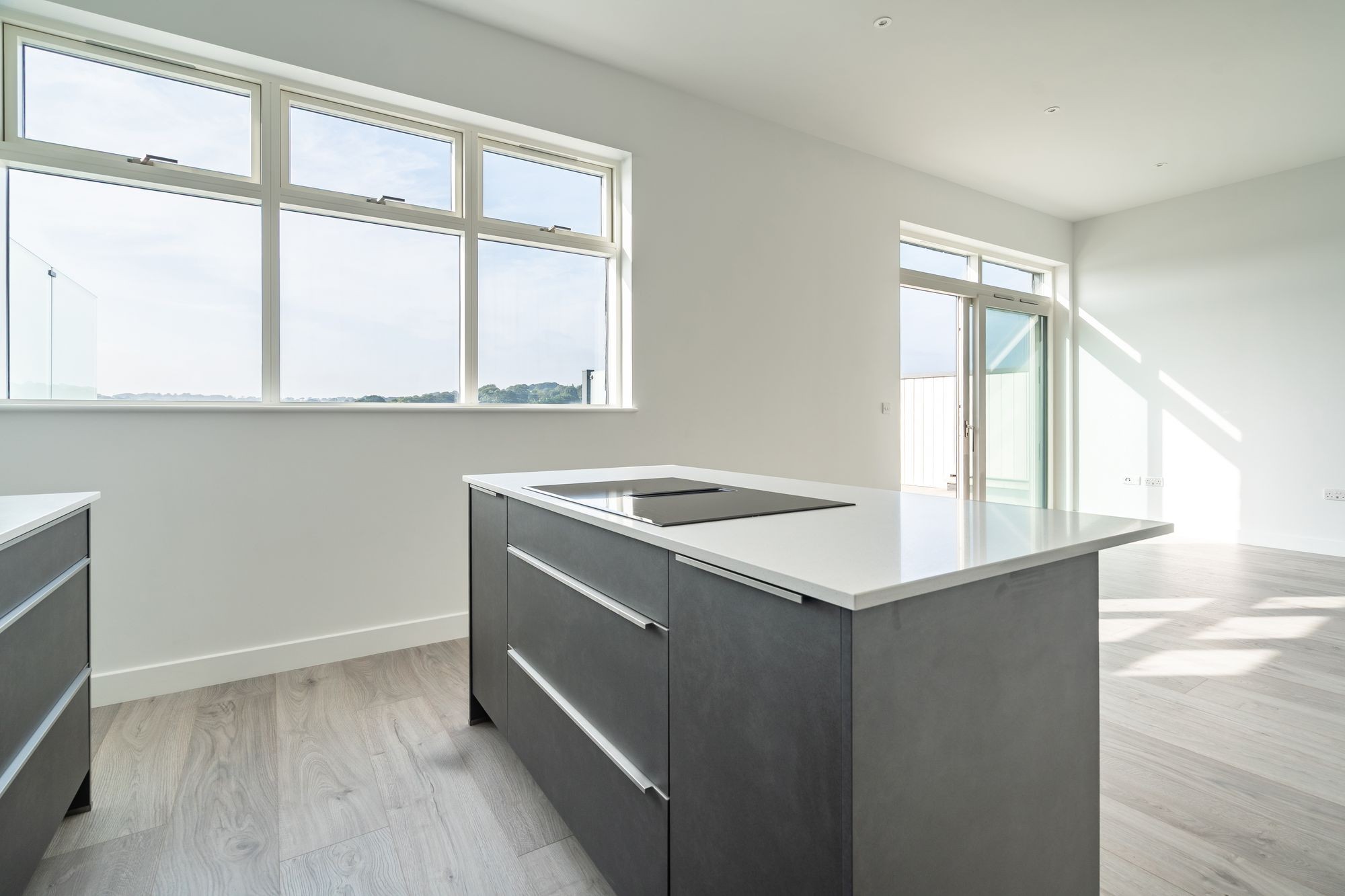 The Penthouse is where the smart, sustainable features, inspiring dual-aspect views, and luxurious contemporary design of Waters Edge meet at their peak. In addition to the broad open plan lounge, designer kitchens and dining space, this large second-floor apartment comprises a master bedroom with en-suite, fitted wardrobes and a walk-in wardrobe, another double bedroom and a third bedroom that also offers excellent conversion opportunities into a home office or hobby room. The living space boasts not only ample room for relaxing and entertaining, but also underfloor heating, Swiss engineered timber flooring with modern features to your home’s environment and designer fixtures of this contemporary luxury home. From your main living room, step out onto the spacious private second-floor balcony to witness the magnificent views of the river, marina, and green hills of Cornwall, as much a feature of Waters Edge as the convenient access to central Falmouth and the rest of the county beyond.