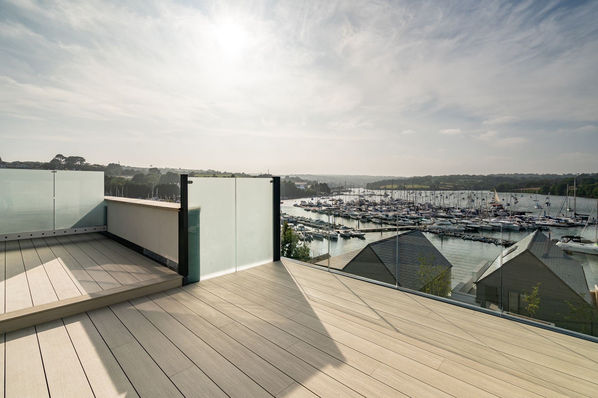 The largest balcony in the building with space for outside dining, providing privacy with obscure glass to the side aspect. The most incredible views towards Penryn River, Falmouth Marina and the countryside beyond. It’s breathtaking when first stepping out onto the large terrace and admiring the 180-degree panoramic views. Further features include composite decking, glass balustrade, outside sockets and lighting.