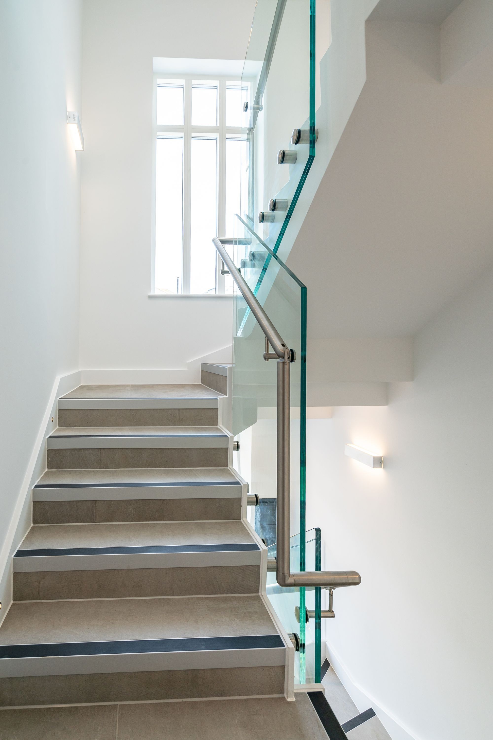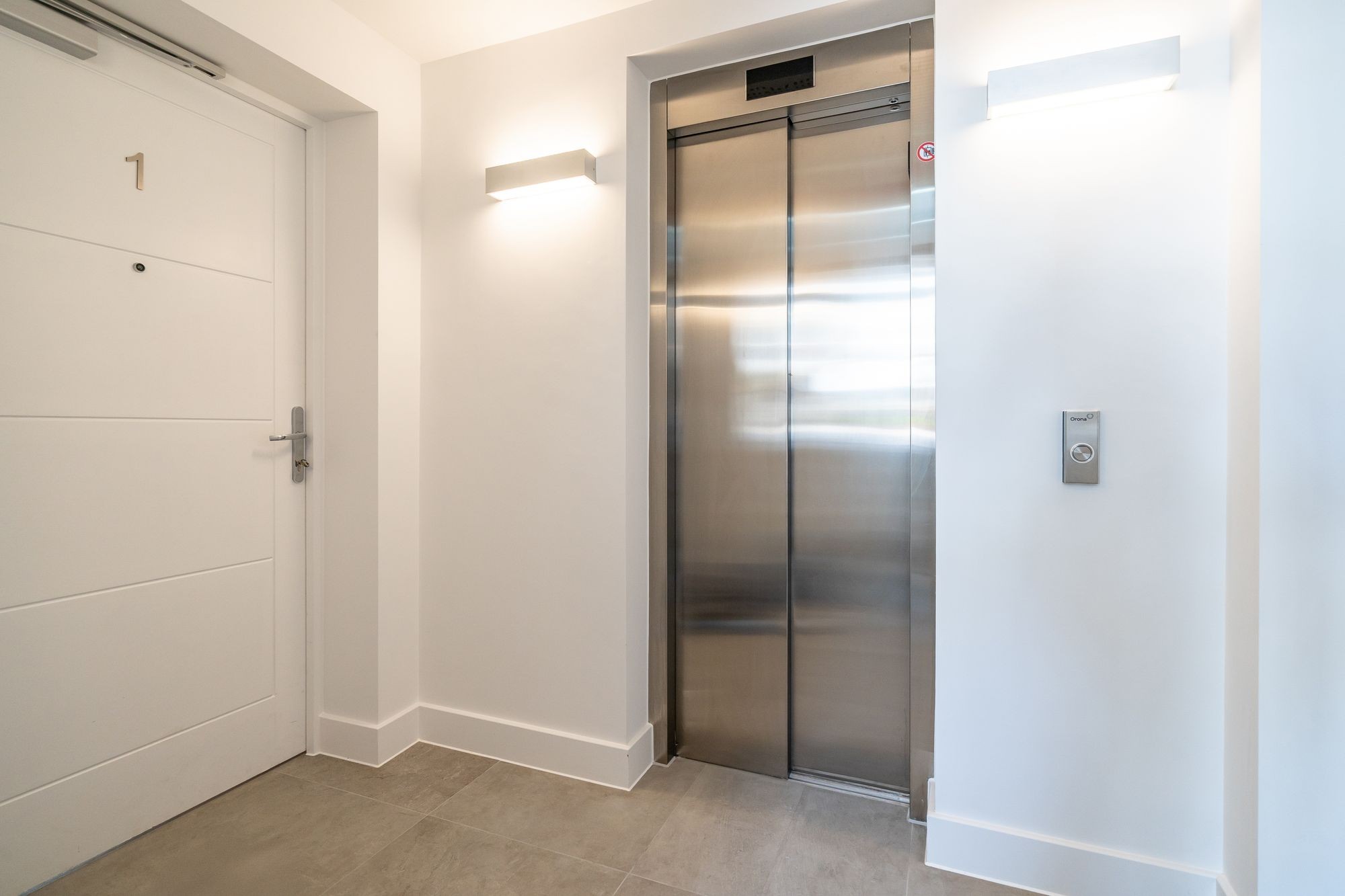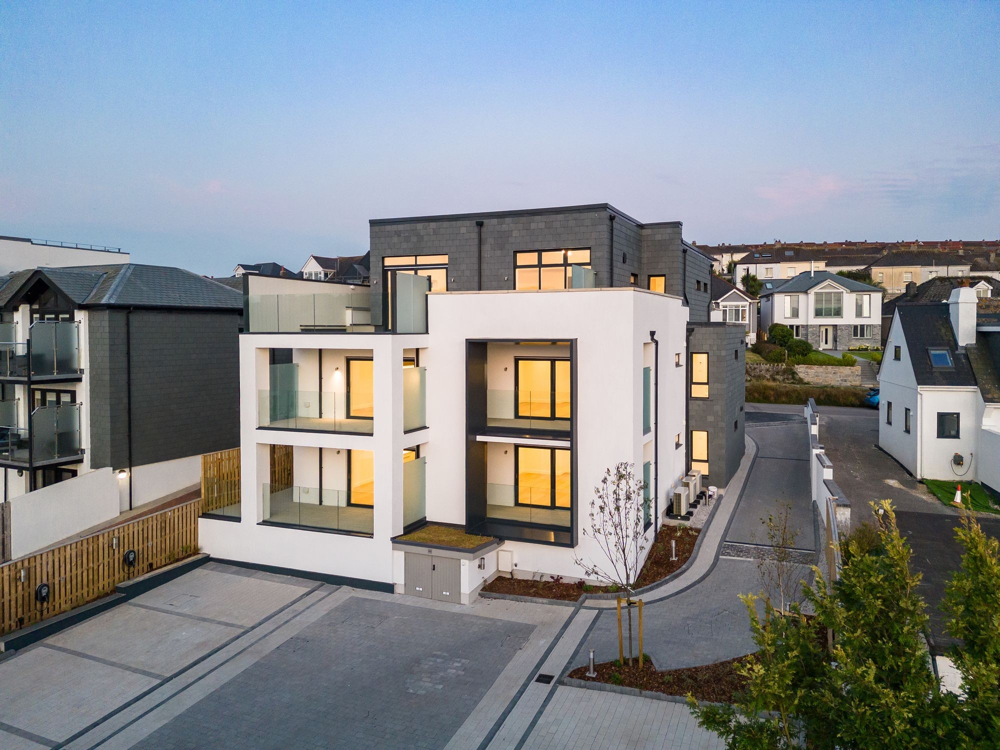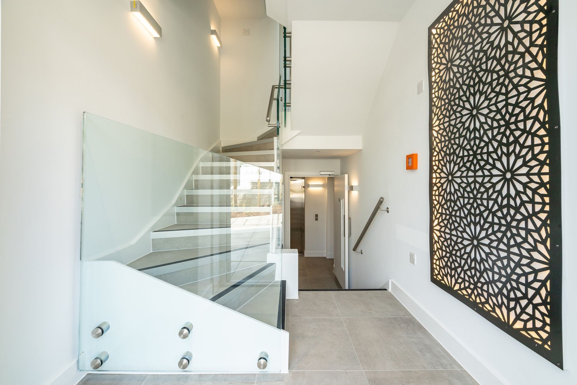 Access to the building is via a secure video entry system to all apartments, leading into a bright and welcoming communal hallway that immediately reflects the quality and craftsmanship of the development. The space features a wide staircase with a sleek glass balustrade, ambient wall and floor lighting, and a high-end tiled floor finish, all contributing to a premium first impression. Steps from the entrance lead down to Apartments 1 and 2 on the ground floor, while a lift provides easy access to Apartments 3, 4 and offers direct private entry into the exclusive penthouse. The wide staircase leads up to the first floor and the penthouse apartment.