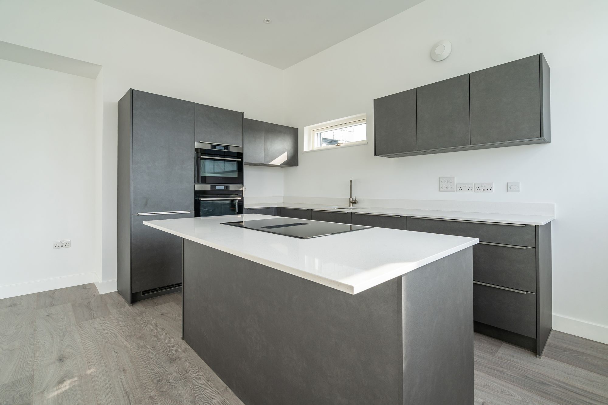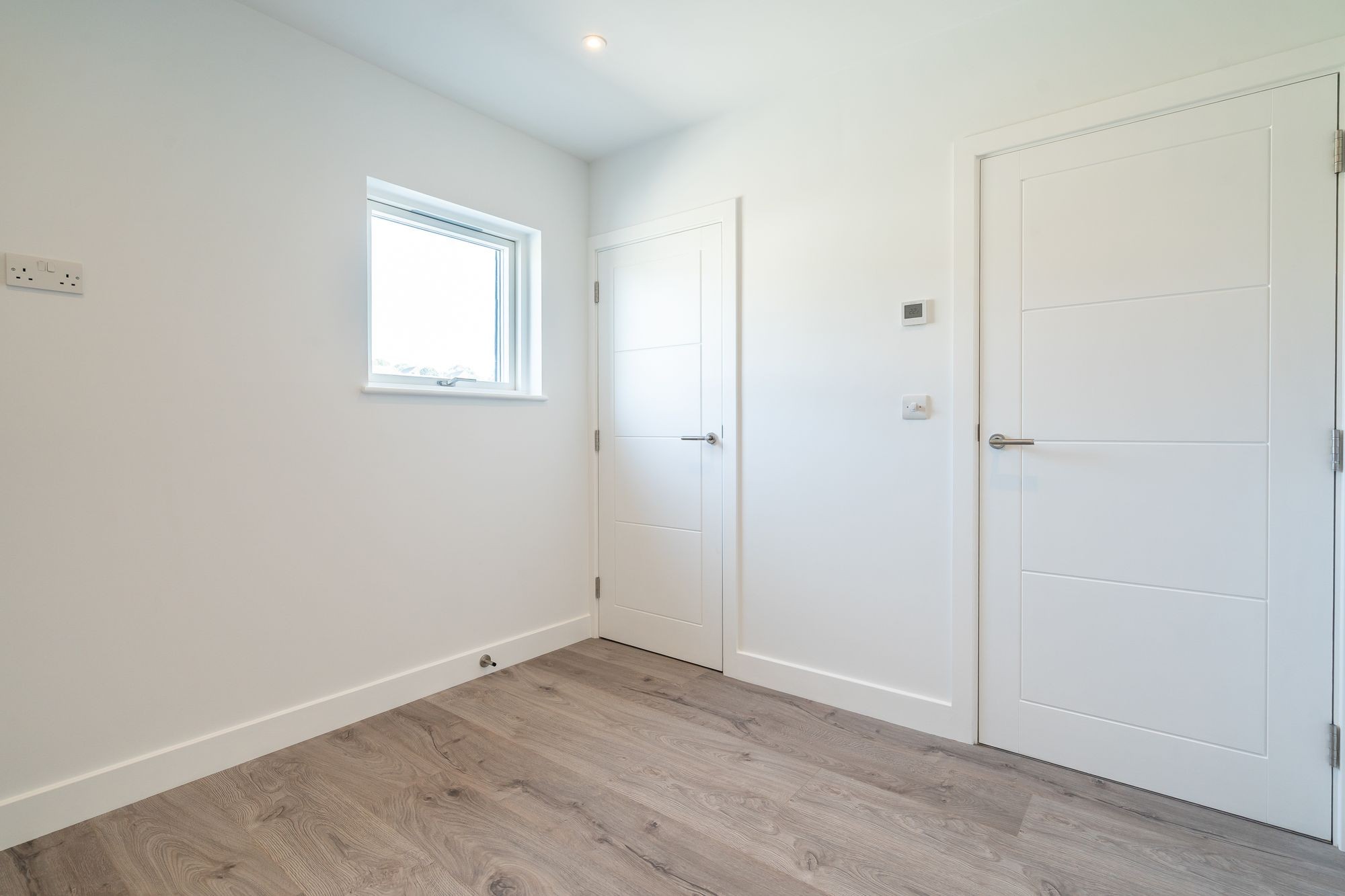 Accessed via a solid oak triple-lock front door with spy hole, the entrance hallway sets the tone for the quality found throughout the property. Solid oak, white-painted internal doors lead off to the open-plan living area, three well-proportioned bedrooms, the main bathroom, and a convenient storage cupboard. A separate plant room houses the large pressurised hot water tank servicing both the bathroom and en-suite, as well as the main board for the underfloor heating controls, BT Openreach connection point, and the electric RCD fuse box. The hallway and all living spaces are finished with high-quality engineered oak flooring, complete with underfloor heating and individual thermostat controls. A video telephone entry system provides added security and convenience.