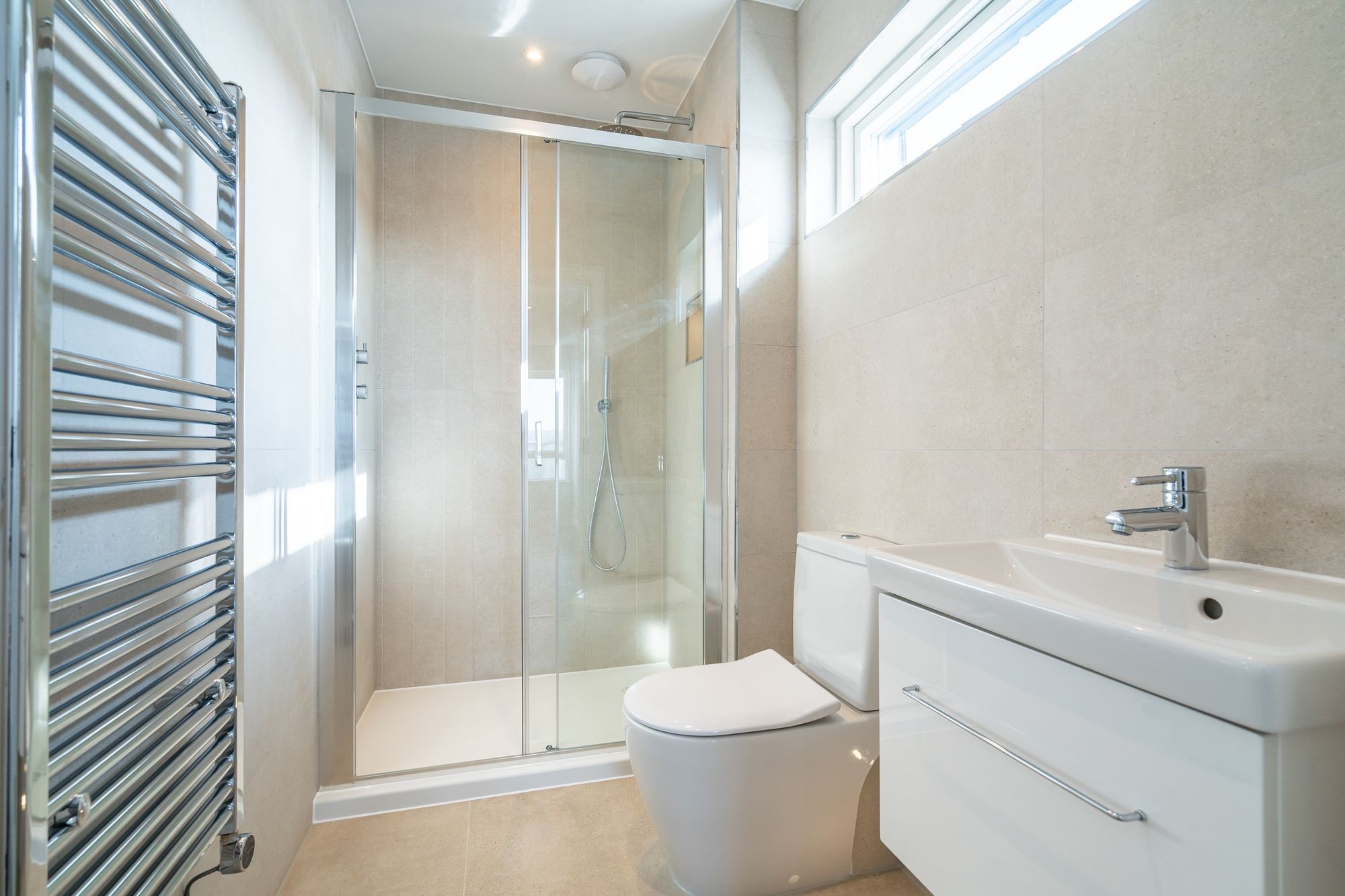 A contemporary finish with sanitary ware from ‘Villeroy & Boch’ and chrome brassware by ‘Cifial’. A large walk-in shower with glass screen, inset shelving with lighting, 'Porcelanosa’ tiled surround, rainfall shower fixing over and a separate handheld attachment. Wash basin with mixer tap, vanity unit, a large, fixed mirror with shelving. WC with push button flush. Similar tiled flooring with underfloor heating, extractor fan, heated towel radiator and shaver points. Double glazed window to front aspect and ceiling spotlights. Motion sensor wall lights.