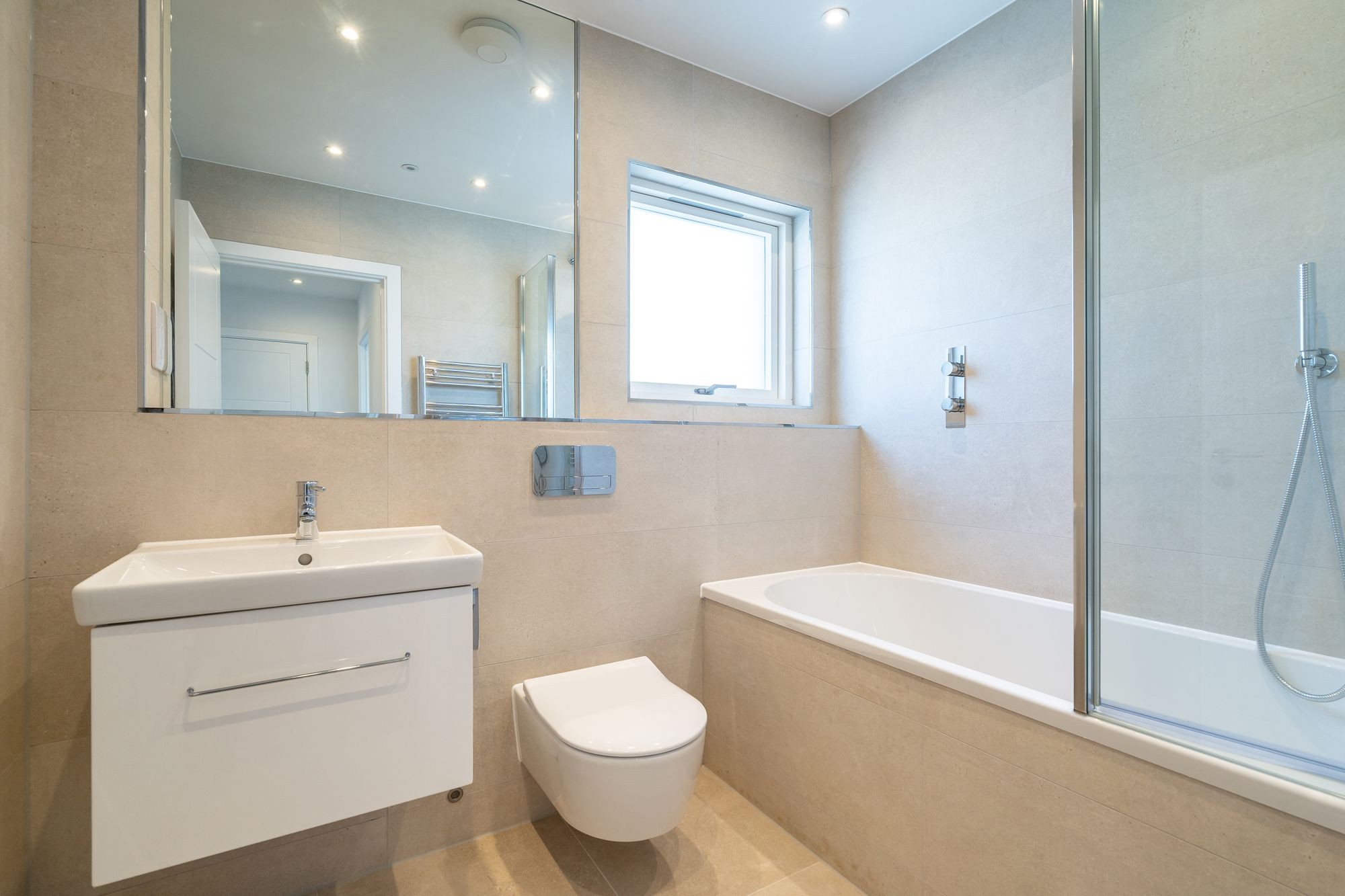 Stylish and sleek design with ‘Porcelanosa’ tiling, contemporary sanitary ware by ‘Villeroy & Boch’, vanity units, chrome brassware by ‘Cifial’, large inset mirror with shelving and an electric towel rail. Three-piece white suite comprising panelled bath with rainfall shower attachment above, separate handheld attachment, glass screen and inset shelving with lighting. Wash basin with mixer tap and vanity unit and WC with push button flush. Tiled flooring with underfloor heating, shaver points, ceiling spotlights, motion sensor wall lights and extractor fan.