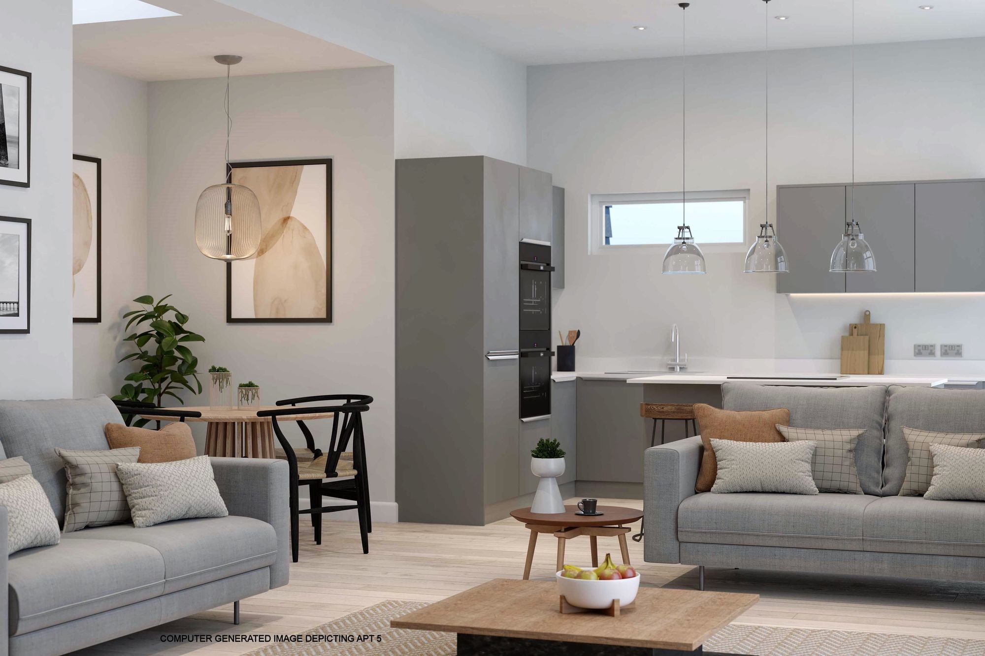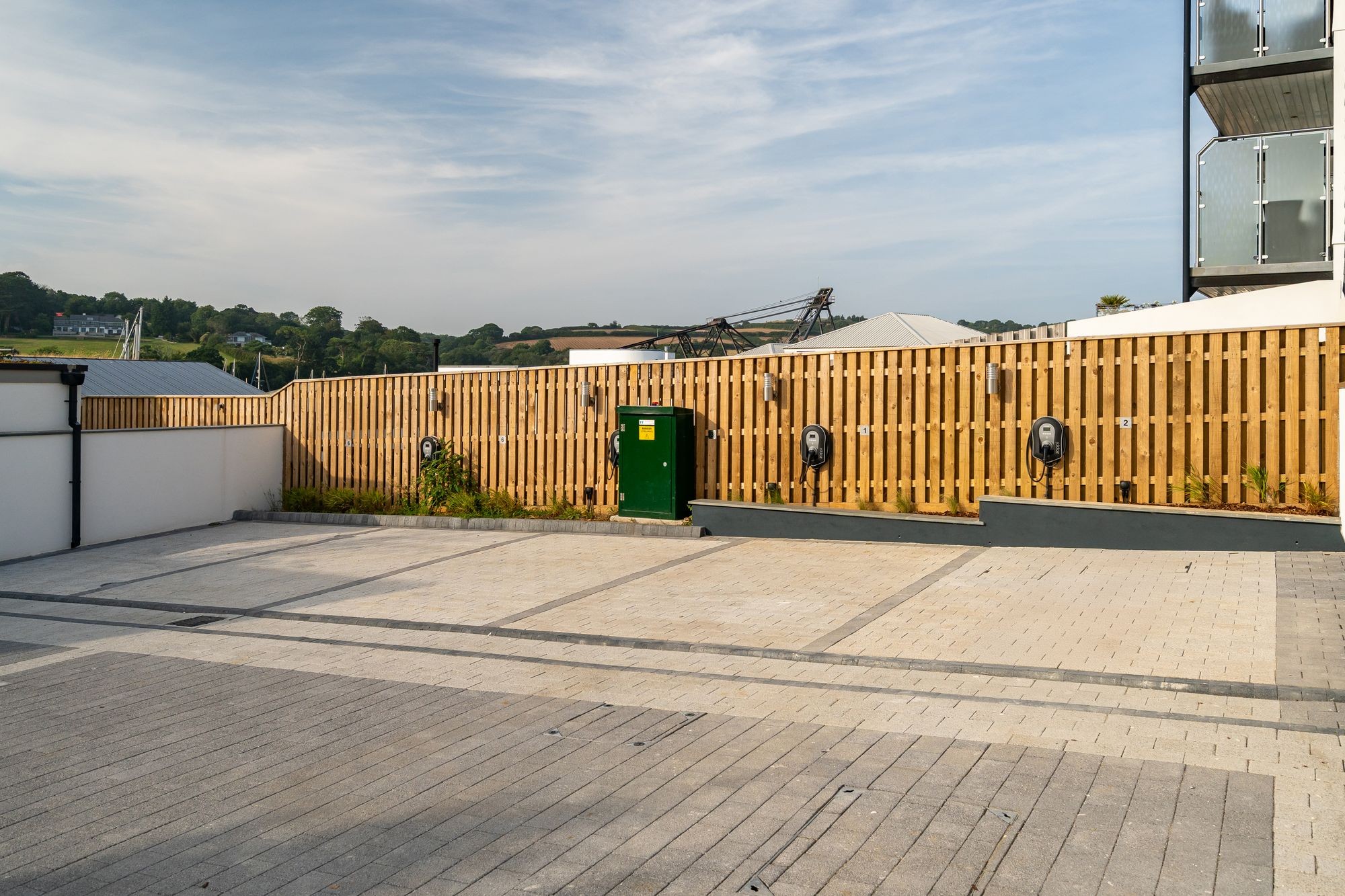 The front of the apartment building is enhanced by thoughtfully landscaped gardens, featuring a blend of paved pathways, mature shrubs, and newly planted trees, all enclosed by a handsome granite wall and fencing that defines the boundary area. To the side of the building, a discreet wooden storage area accommodates refuse bins, while communal external lighting is strategically positioned at the front, side, and rear of the building to always ensure convenience and safety. To the rear, residents benefit from a secure, lockable communal bike storage unit — ideal for those who enjoy an active lifestyle. In keeping with the building’s eco-conscious design, individual air source heat pumps for each apartment are located to either side of the property.