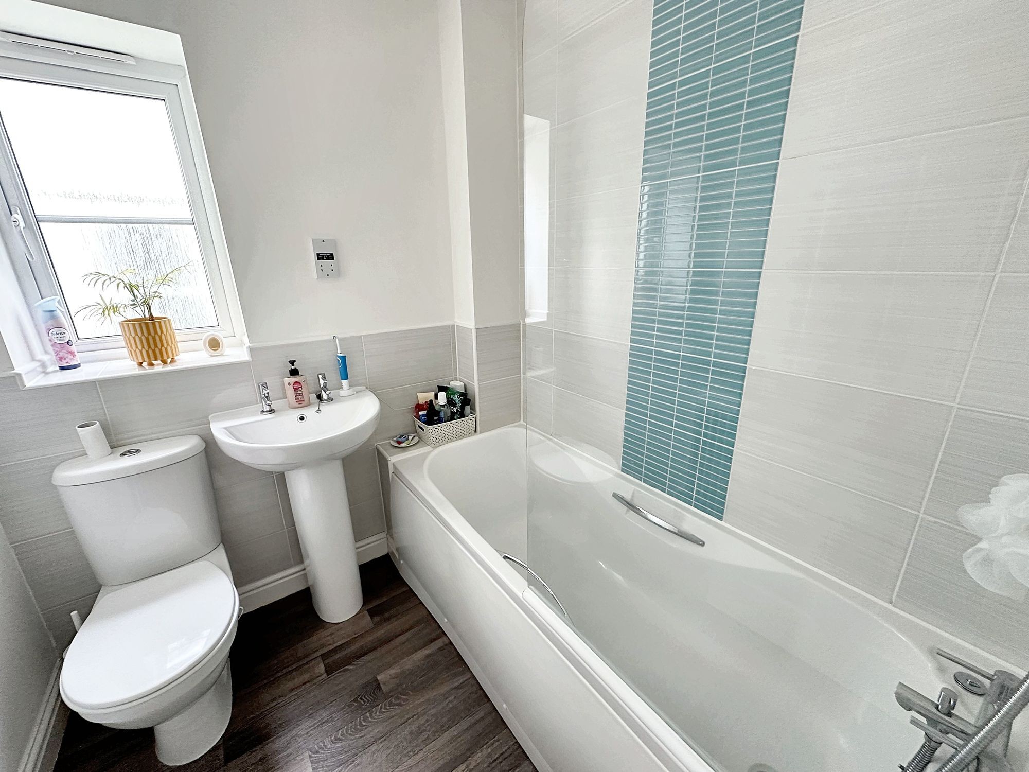 White suite that comprises: bath with plumbed shower over, pedestal hand wash basin and low-level flush W/C. Tiled wet area. Extractor. Radiator. Obscure window.