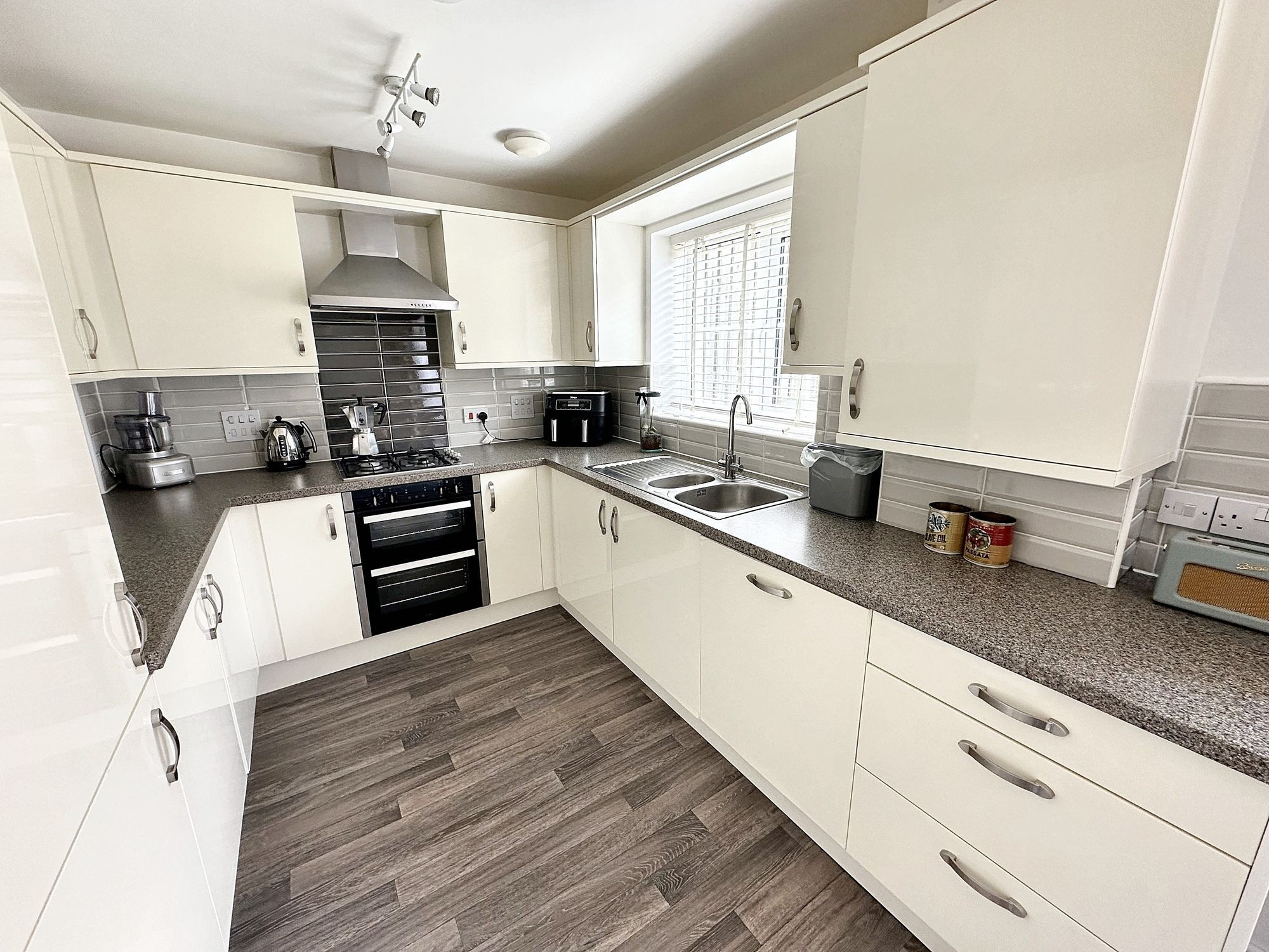 Cream fronted eye and base level units and a dark worktop with one and a half bowl stainless steel sink under a window to the rear. Built-in appliances include: fridge, freezer, electric cooker, gas hob with stainless hood extractor over and dishwasher. A wall cabinet is home to the gas-fired central heating boiler. Nicely tiled splashback. Linoleum flooring.