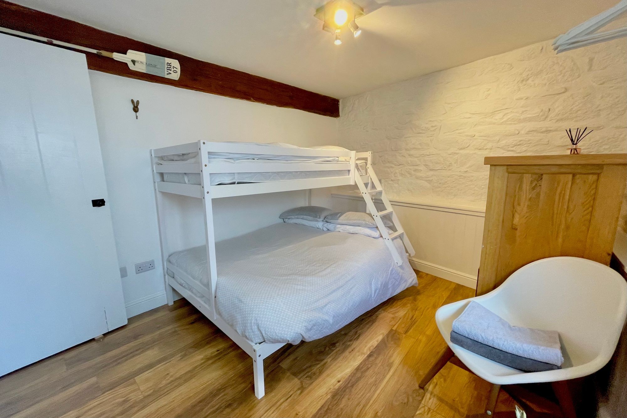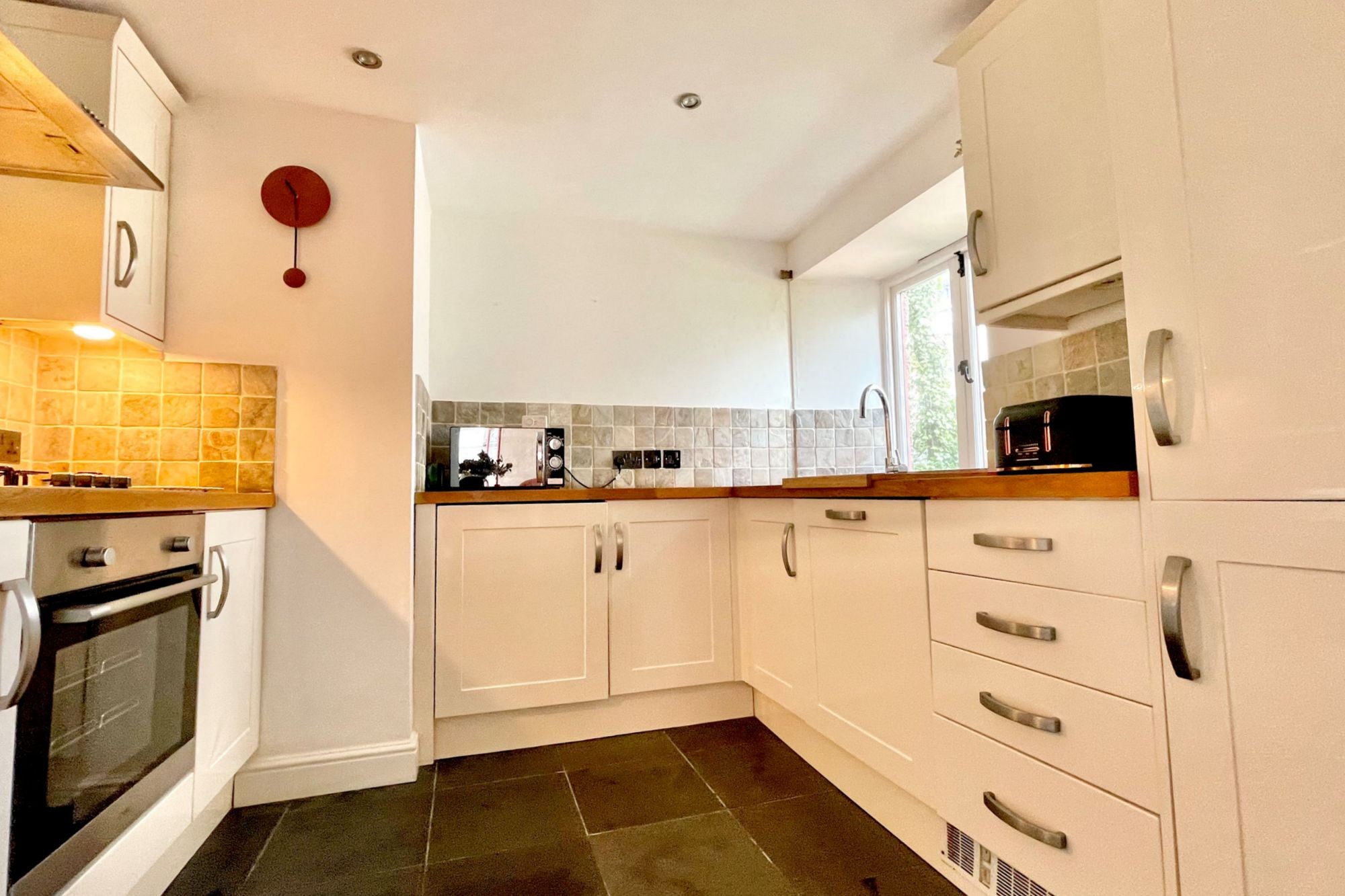 Accessed from the sitting/dining room and a 'Farmhouse' style kitchen. Double glazed window to the side with a slate windowsill. Fully fitted kitchen, wooden worktop surfaces with tiled splashback, stainless steel sink with mixer tap. Integrated appliances include a tall fridge freezer, washing machine, dishwasher and oven with four ring gas hob and extractor hood over. Cupboard housing modern gas combination boiler fuelling the hot water and radiators. Tiled flooring. Ceiling spotlights.