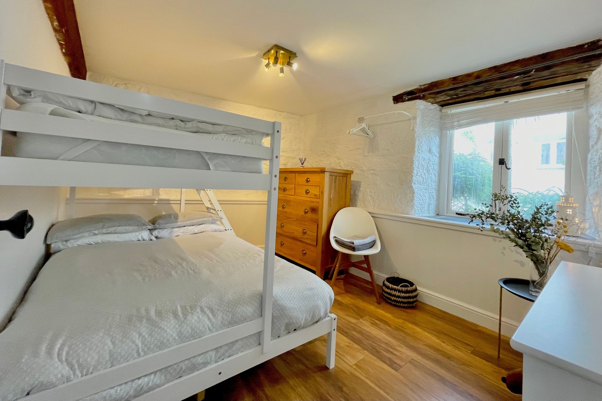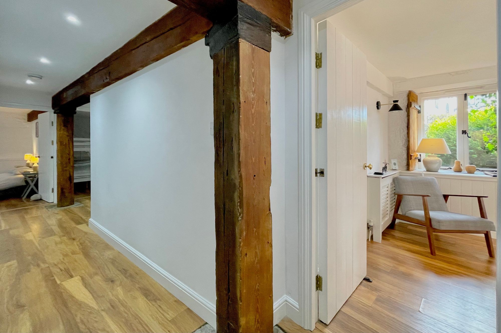 This is a wonderful room and the main hub of the apartment with beautiful water views towards Penryn River via three double glazed windows, two of which open to enjoy the water views and both with window seats. Sense of charm and character throughout including wooden beams, lintels, whitewashed stone walls and window shutters. Wooden panelling surround with top shelf, wall and ceiling lights. Continuation of the engineered oak flooring. BT Openreach broadband connection and telephone entry system. Two radiators.