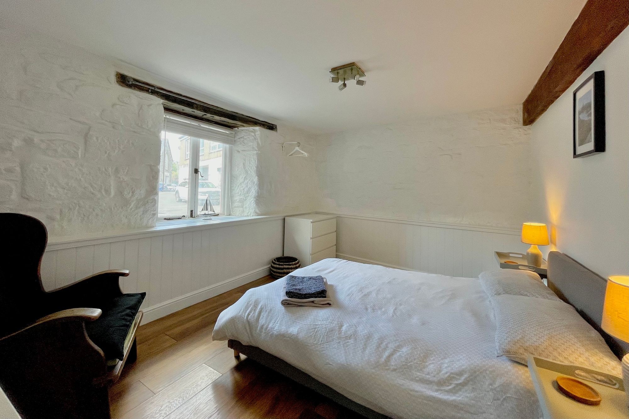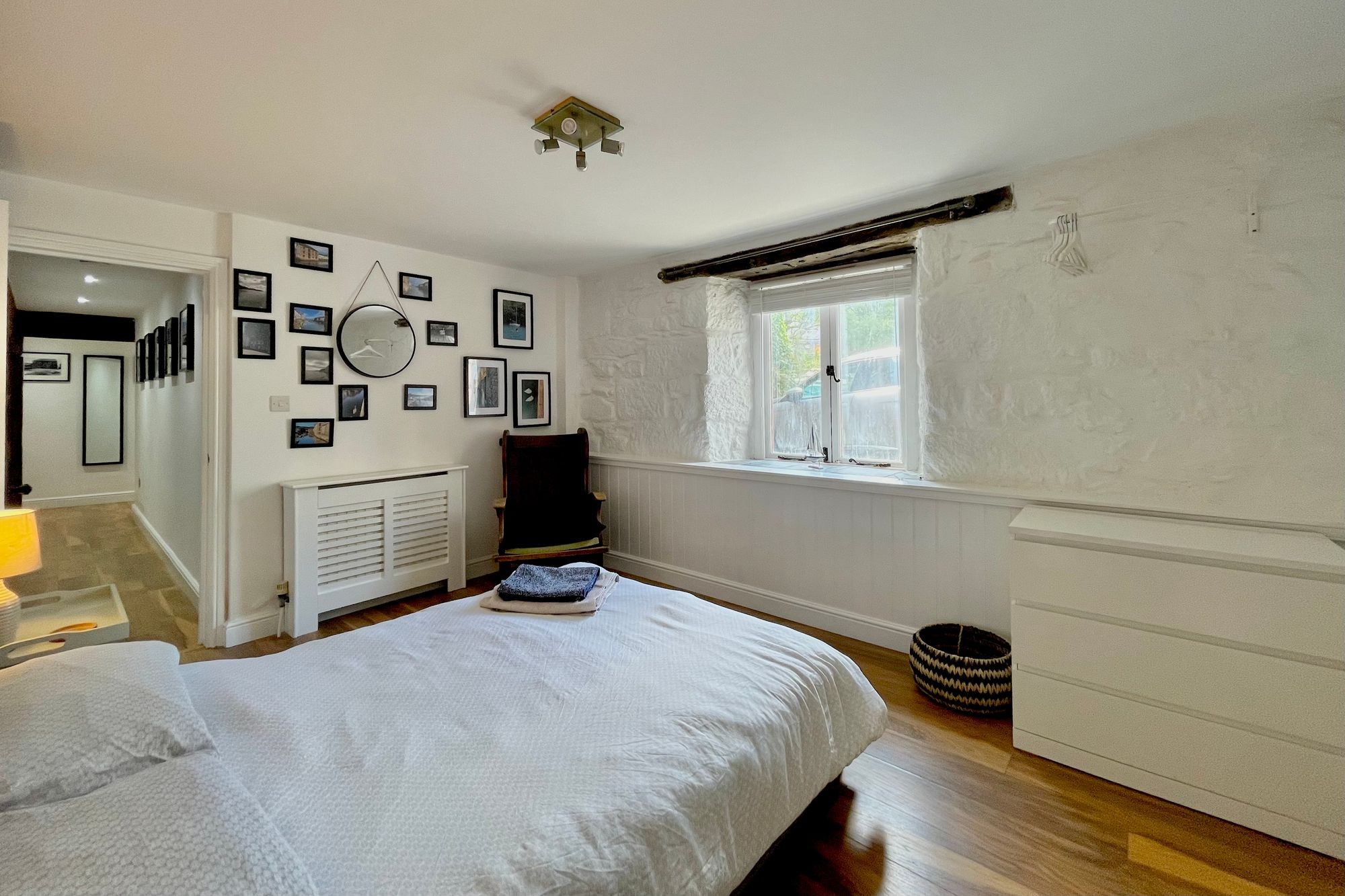 Beautifully presented main bedroom with characterful features including wooden beam and lintel and whitewashed stone walls. Double glazed window to the front with slate windowsill. Continuation of the engineered oak flooring and wooden panelling surround with top shelf. Radiator.