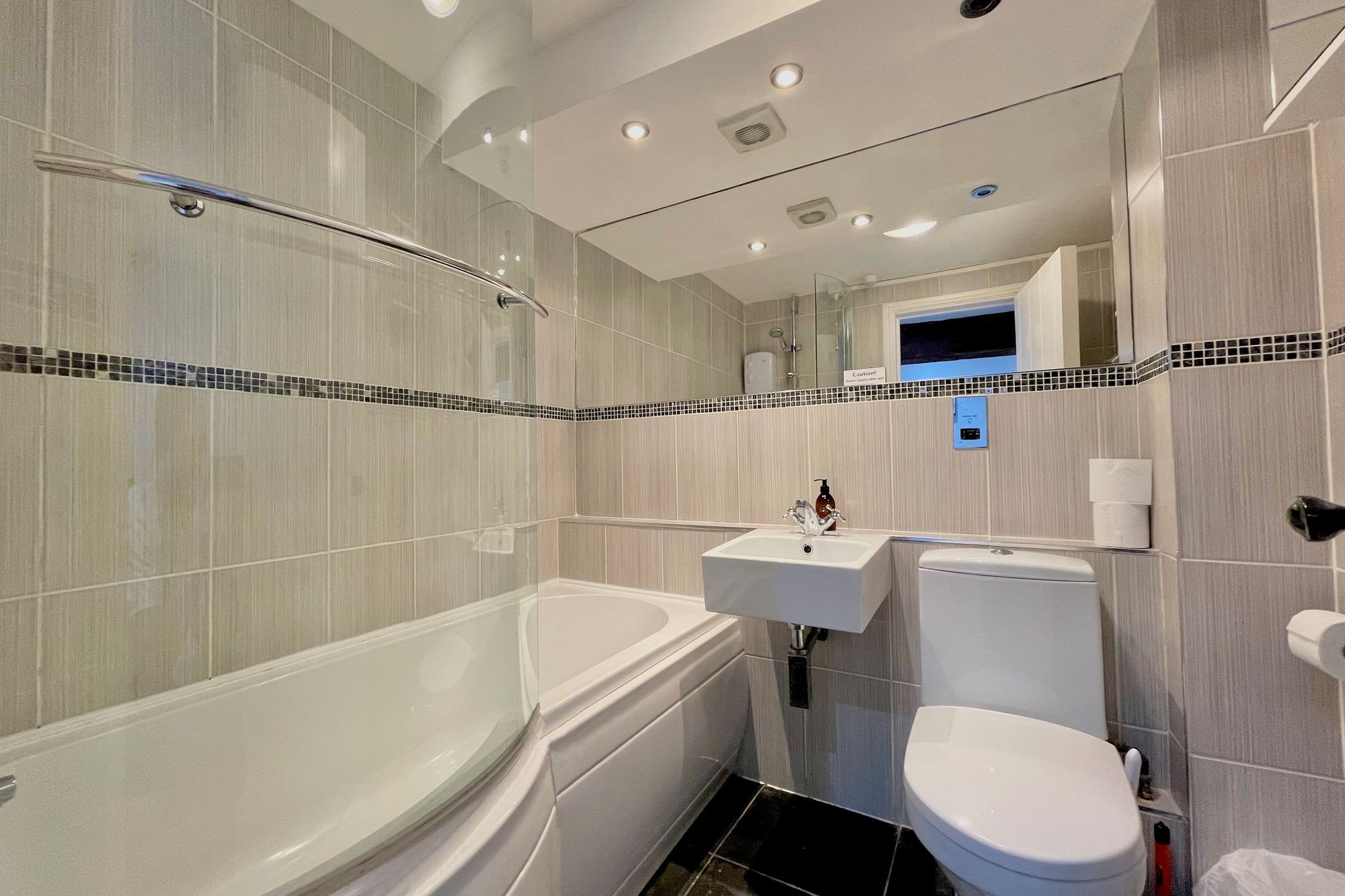 Modern white three-piece suite comprising a large panelled bath with mixer tap, electric shower over and clear shower screen, mounted wash basin and low level flush WC. Slate flooring, fully tiled surround with wall mirror fixing, spotlights, shaver point, heated towel radiator, extractor fan.