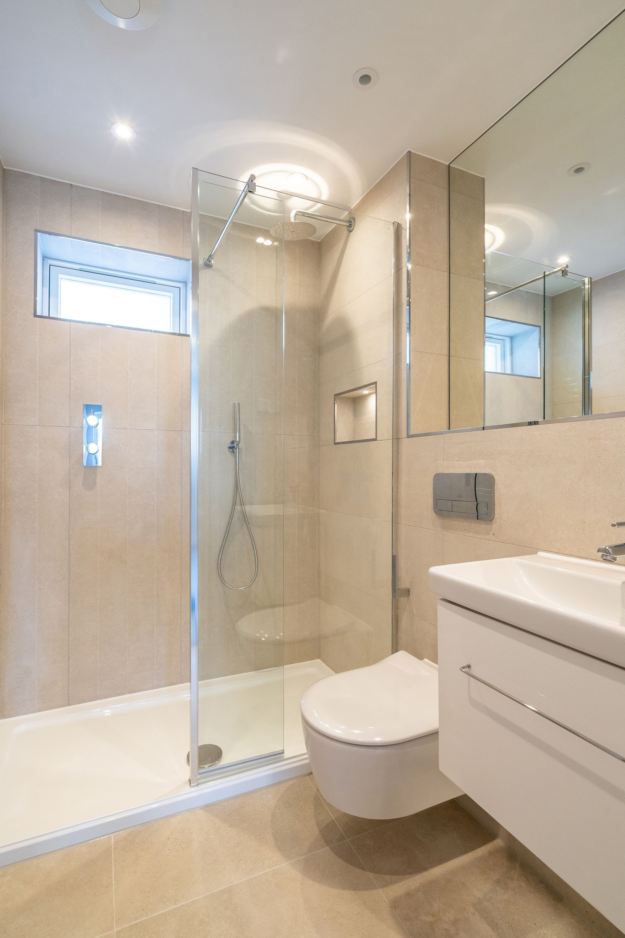 A contemporary finish with sanitary ware from ‘Villeroy & Boch’ and chrome brassware by ‘Cifial’. A large walk-in shower with glass screen, inset shelving with lighting, 'Porcelanosa’ tiled surround, rainfall shower fixing over and a separate handheld attachment. Wash basin with mixer tap, vanity unity, a large, fixed mirror with shelving. WC with push button flush. Similar tiled flooring with underfloor heating, extractor fan, heated towel radiator and shaver points. Double glazed window to front aspect and ceiling spotlights. Motion sensor wall lights.
