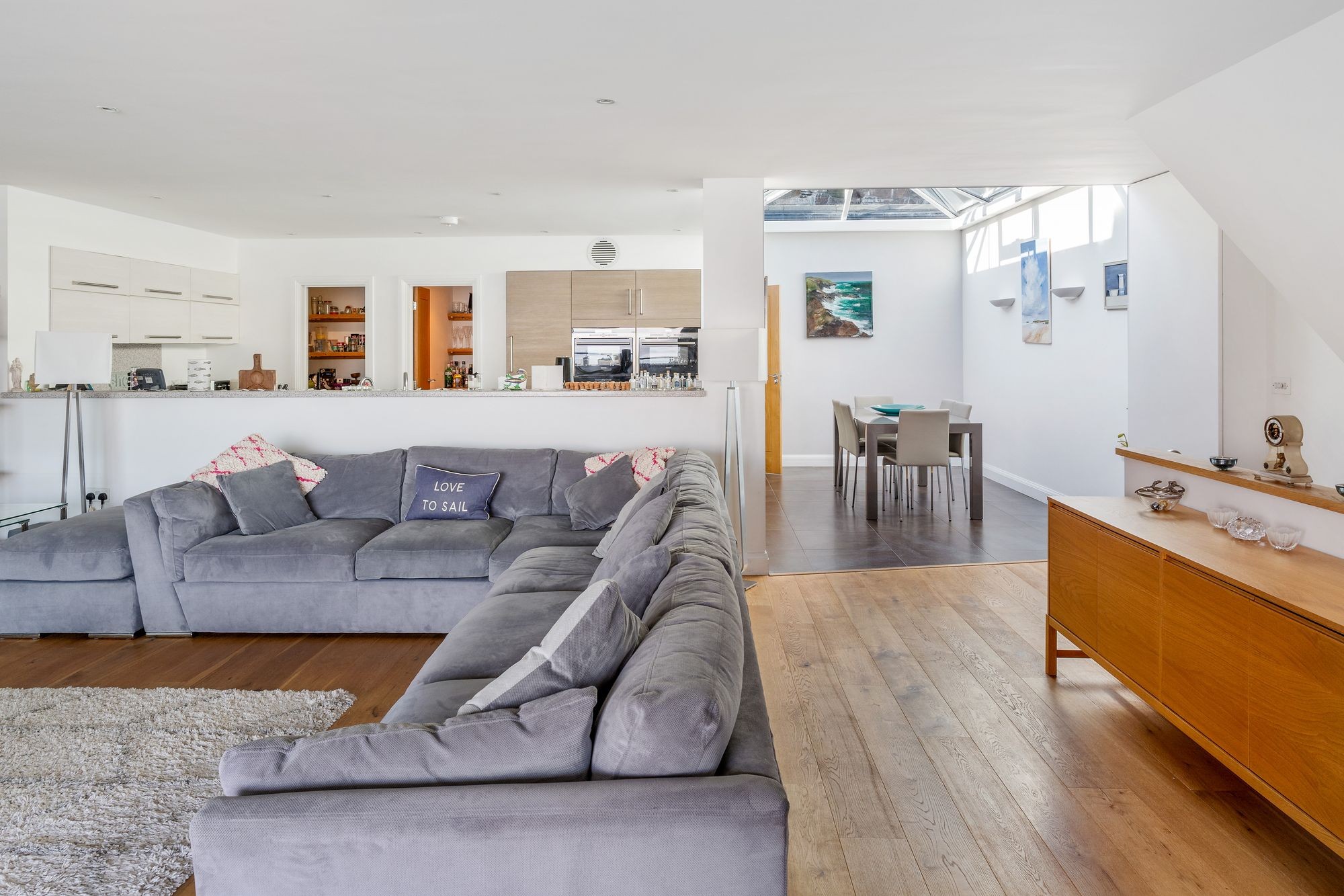 Tile floor and French doors leading out into the garden. Semi-circular wall lights. Oak doors to guest suite, bathroom four and plant/boiler room.