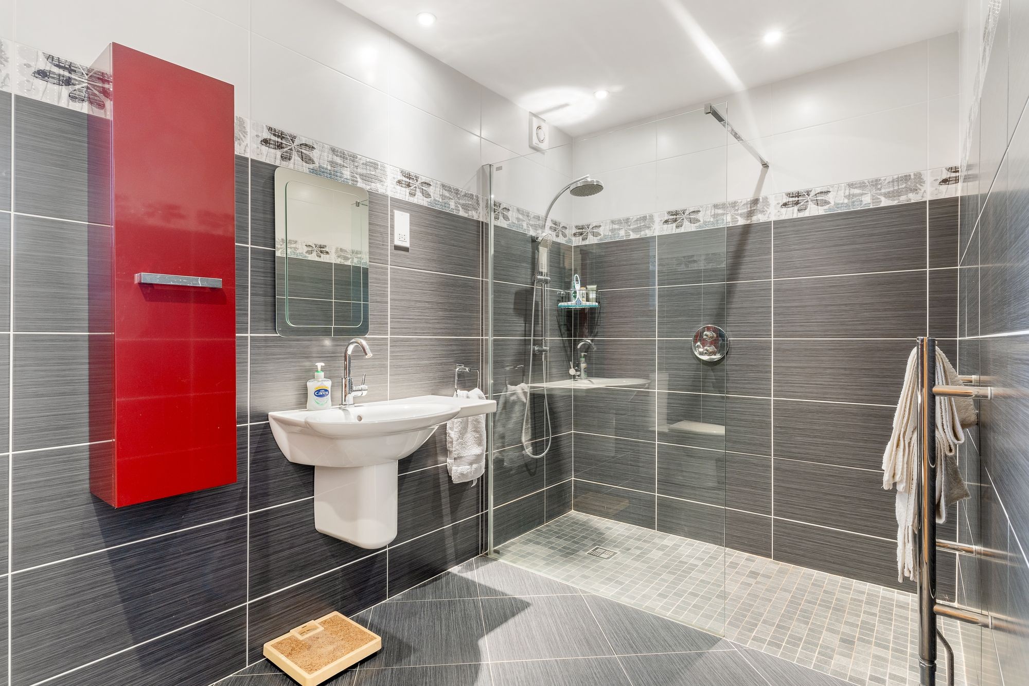 A very spacious, comfortable room with full ceramic floor and wall tiling and spotlit ceiling. Obscure UPVC double glazed window to side. Laufen button flush WC, twin wash hand basins and a large bath with central taps and shower mixer. Large walk-in wet area and shower. Heated towel radiator. Medicine cabinet, dual glass shelves and shaver/electric toothbrush points. Extractor fan.