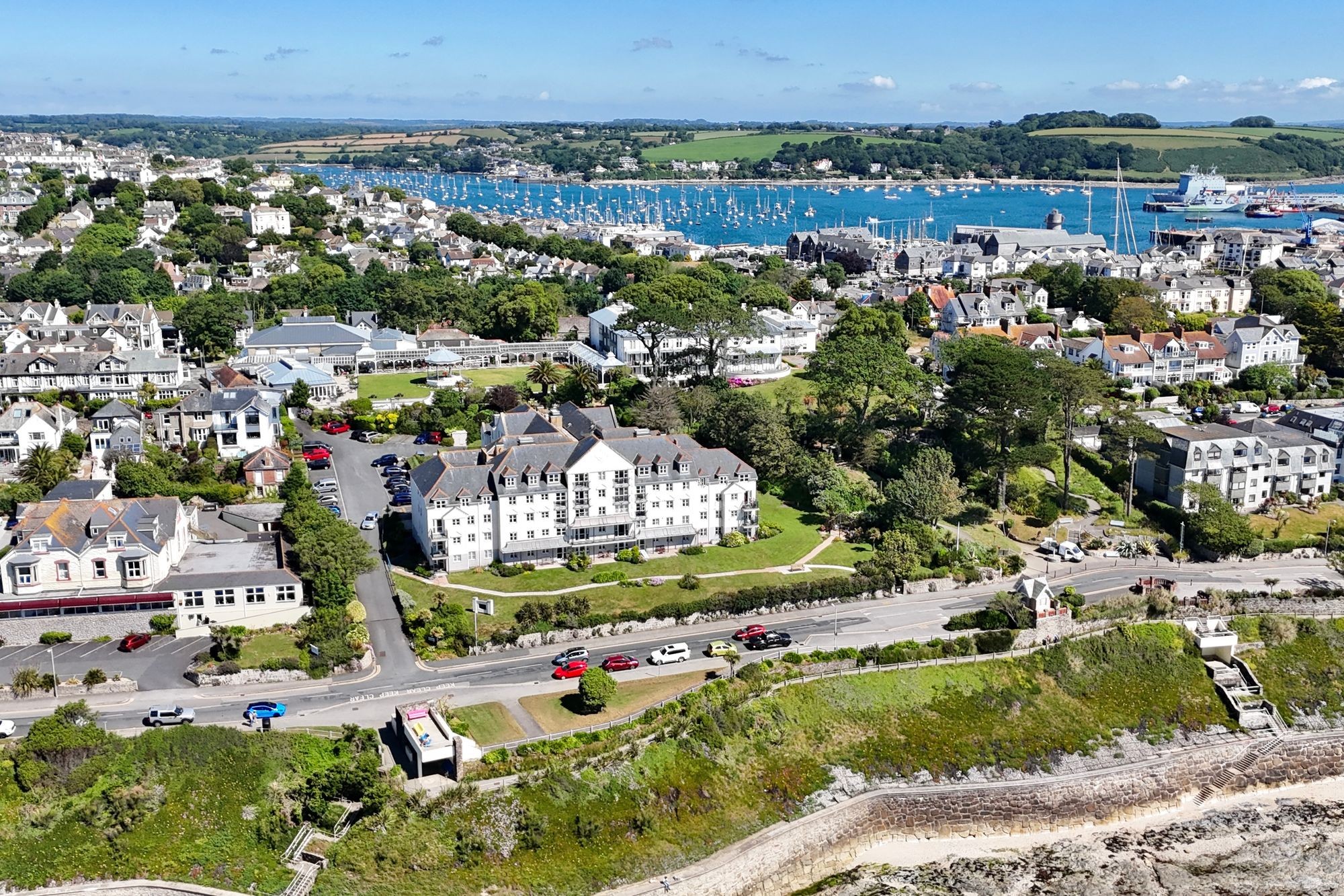 Bay Court is incredibly well located along Falmouth's seafront in a prominent front row position looking out to sea. The development is set within lovely landscaped gardens,moments from the coastal path and beaches and just a few minutes walk from the excellent ‘early ‘til late’ Co-op, Gyllyngvase beach and cafe. Next door to Bay Court is the Princess Pavilions , host to a variety of acts, comedians and theatre performances, not to mention bands during the summer months in the garden pavilion and a great place for tea, cakes and snacks can be accessed through a gate in the car park. The location is exciting and uplifting and with a bus stop outside, the town and harbourside are within easy reach. The town and its harbourside have an excellent and diverse selection of restaurants and an eclectic mixture of individual shops as well as national chains, together with quality galleries showcasing local talent. Falmouth Town Station, only 10 minutes’ walk away, provides a convenient link to the mainline at Truro for Exeter and London Paddington. Falmouth boasts the third largest natural harbour in the world and is renowned for its maritime facilities which offer some of the best boating and sailing opportunities in the country; little wonder the town is consistently ranked as one of the top five places to live in the UK.