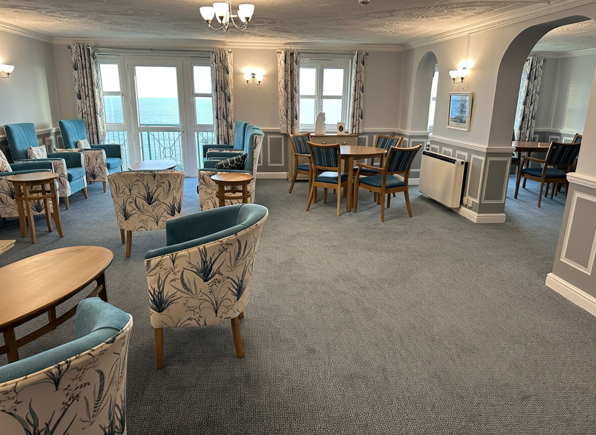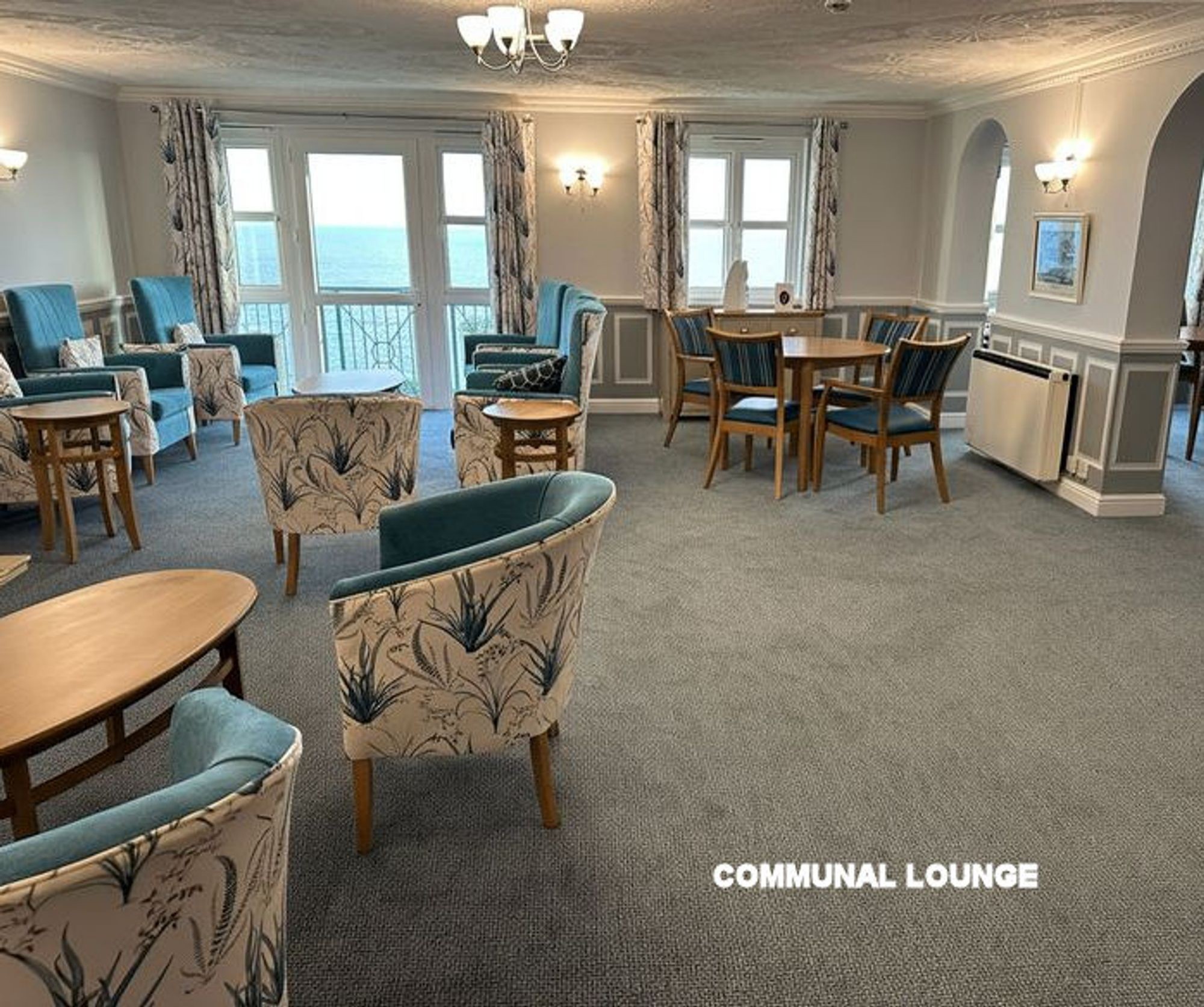 Beautifully presented with recently refitted carpets, this large room has space for sitting and dining. UPVC double windows to side and rear with a view to the sea. Composite stone surround fireplace with inset electric living coal flame fire and electric night storage heaters. TV, telephone and power points. Emergency pull cord. Glazed door to.....
