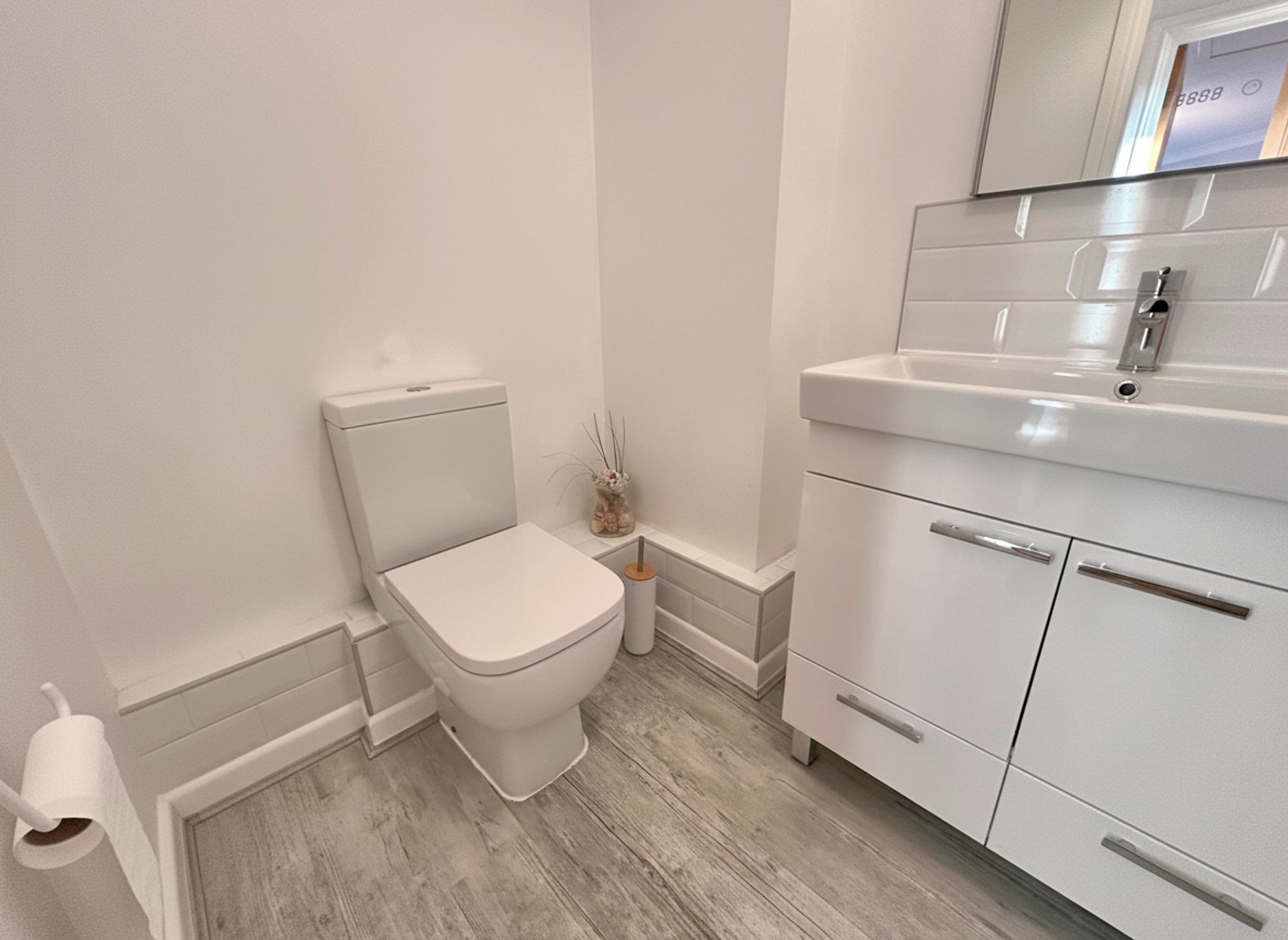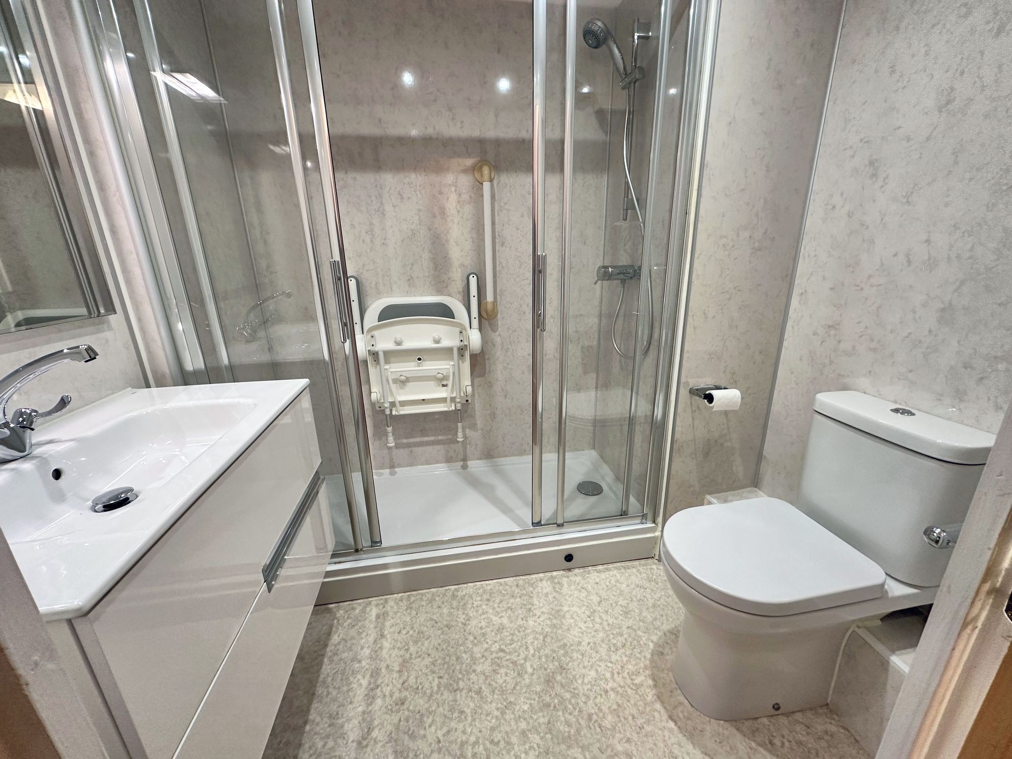 Modern and stylish white suite comprising a large walk-in shower cubicle with twin sliding doors and fixed fold down seat and hand rail. WC, hand wash basin with mirror above, mixer tap and vanity unit below. Extractor fan. Towel rail. Emergency cord.